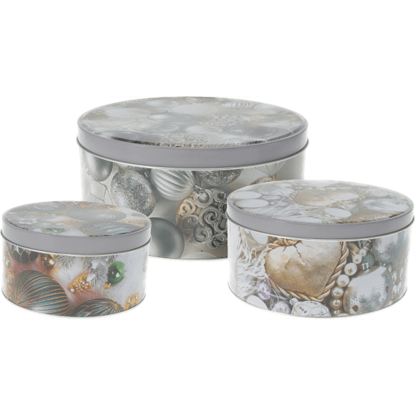 Karácsonyi mintás fémdoboz szett. Egy csomag 3db, méretében és mintájában is különböző fémdobozt tartalmaz. Méretei: nagy: 20x20x9,5 cm, közepes:16,5x16,5x7,5 cm, kicsi: 14x14x6,5 cm.