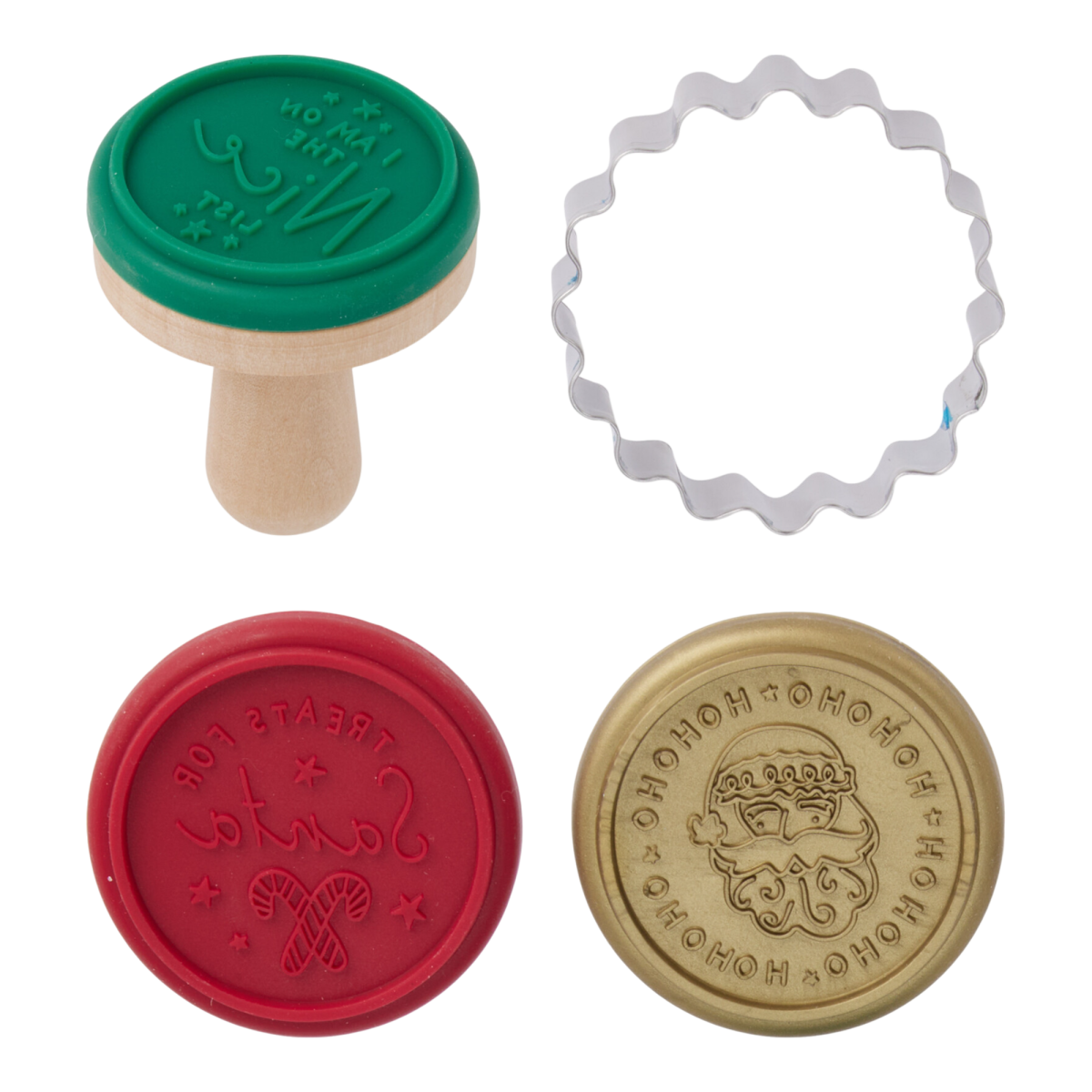 Praktikus, 4 részes készlet sütikhez: 3 db szilikon bélyegző (piros, zöld, arany) és 1 db kerek süteményvágó rozsdamentes acélból. A bambusz, rozsdamentes acél és szilikon kombinációja egyszerű használatot tesz lehetővé.