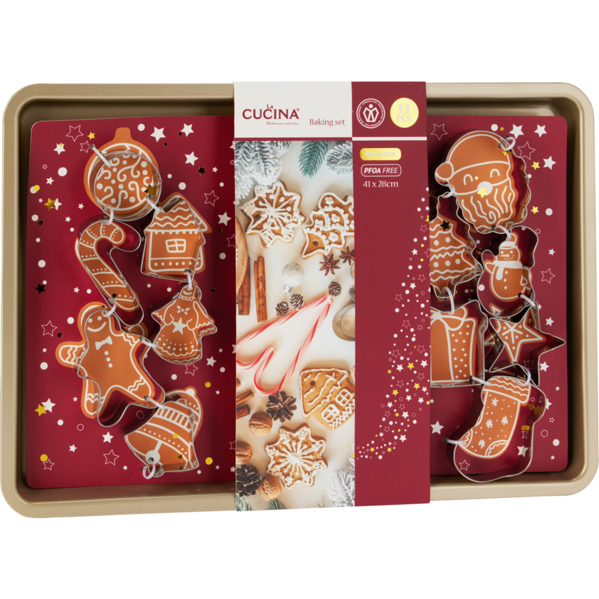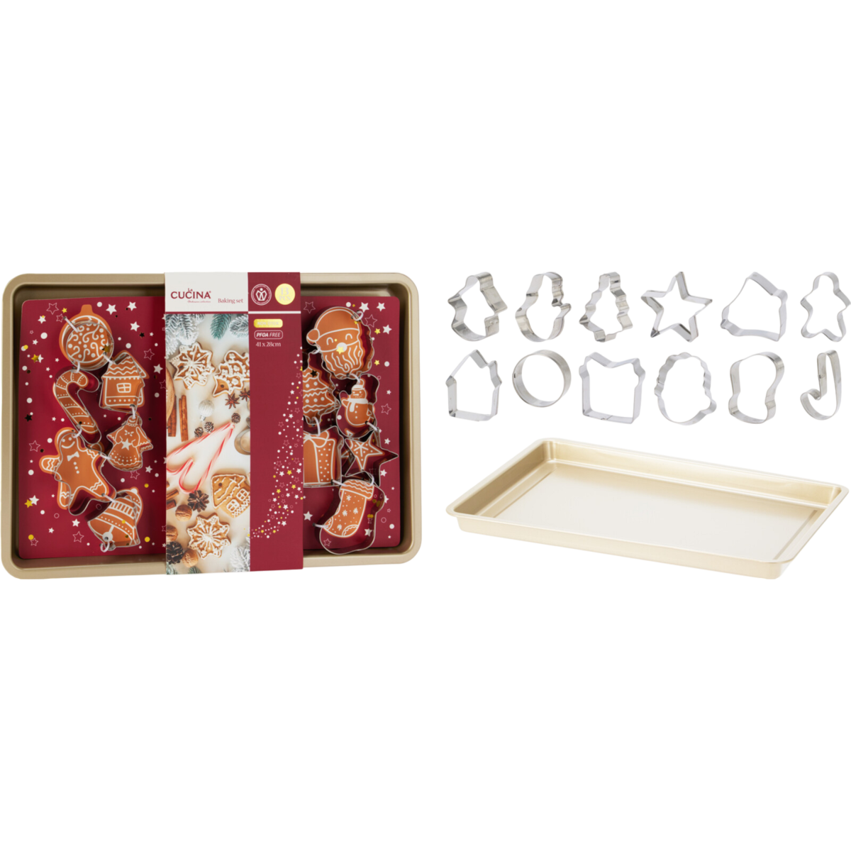 Mindennel felszerelt ünnepi szett a tökéletes mézeskalácsokhoz és linzerekhez: tapadásmentes tepsi pezsgőarany színben, hozzá 12 db rozsdamentes acél kiszúró klasszikus karácsonyi motívumokkal.
