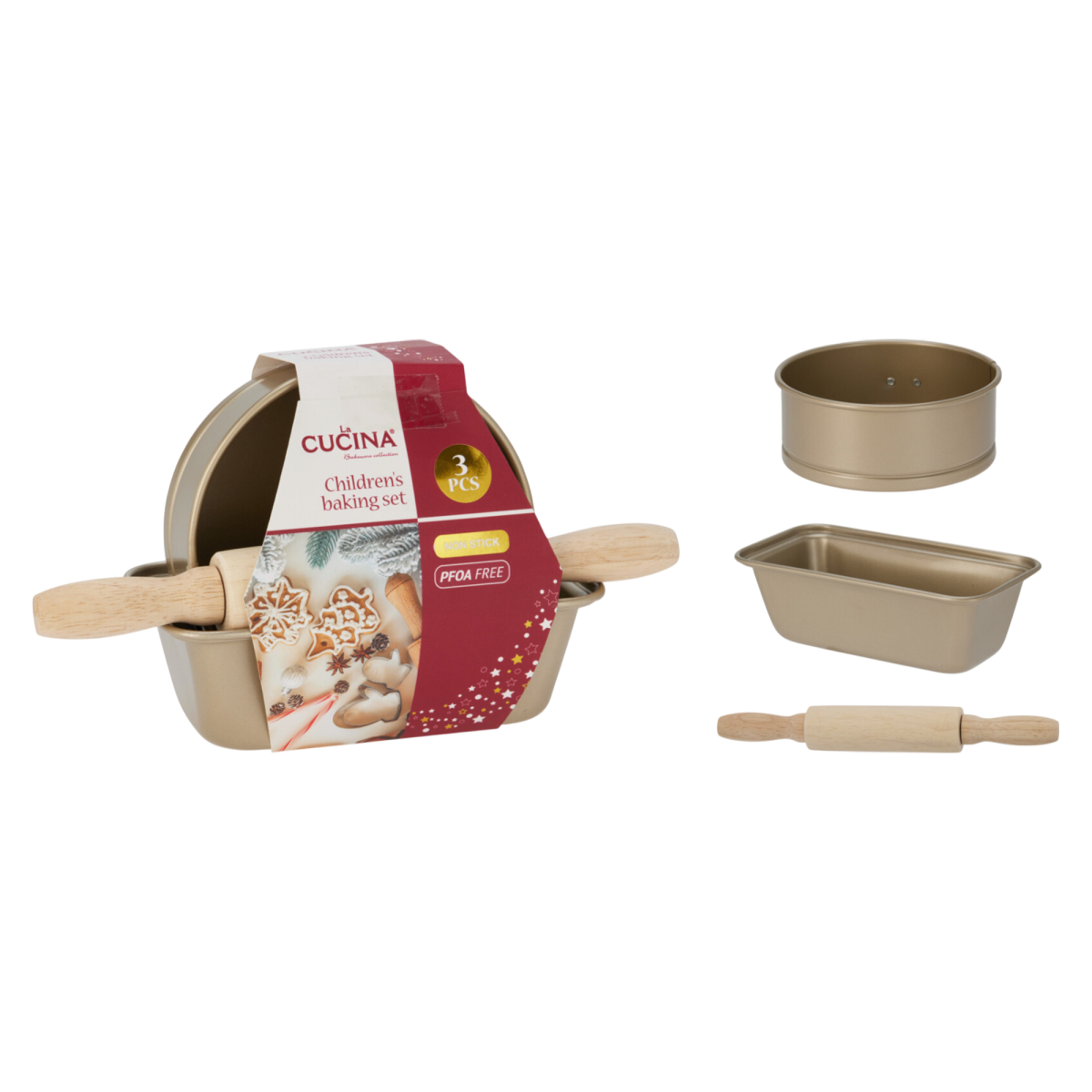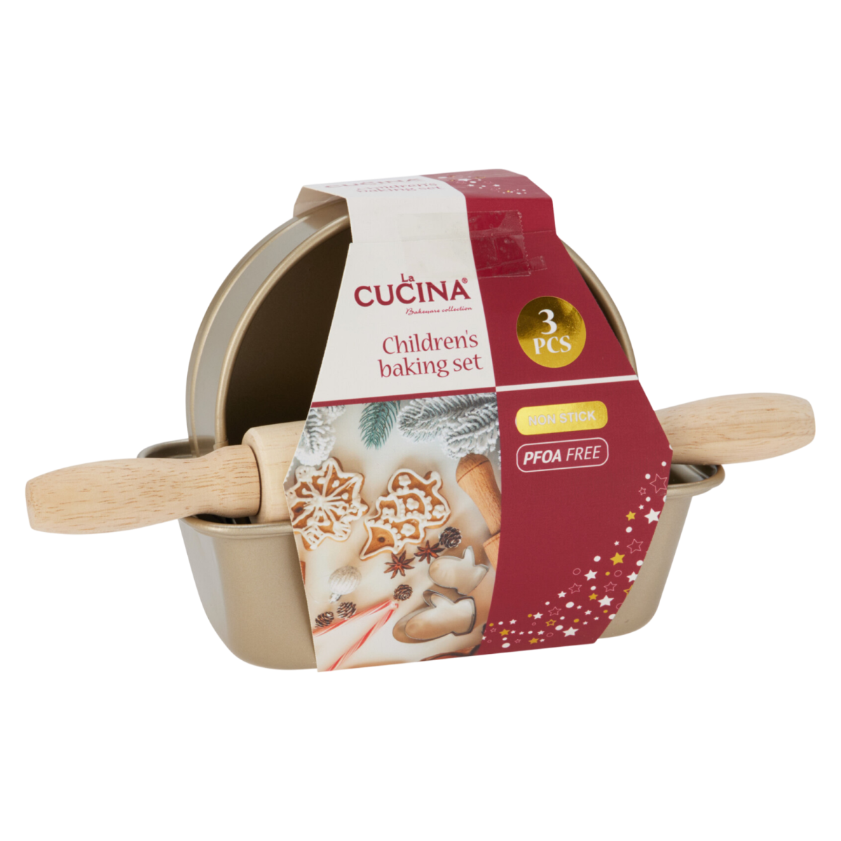Lepd meg a kis konyhatündéreket ezzel a vidám, karácsonyi hangulatú sütőkészlettel! A praktikus 3 darabos szett mindent tartalmaz, amire a közös sütögetéshez szükség lehet. A tapadásmentes pezsgőarany formák és a fából készült sodrófa könnyen kezelhetők, biztonságosak és élvezetes használatot kínálnak a gyerekeknek.