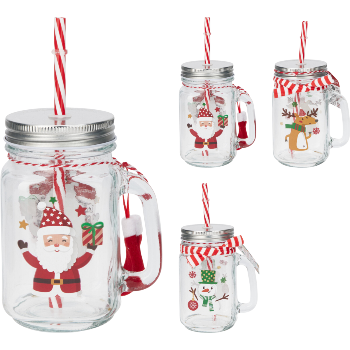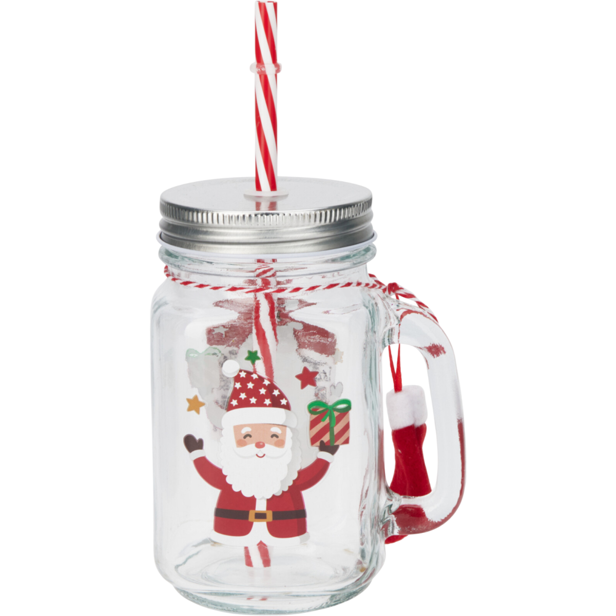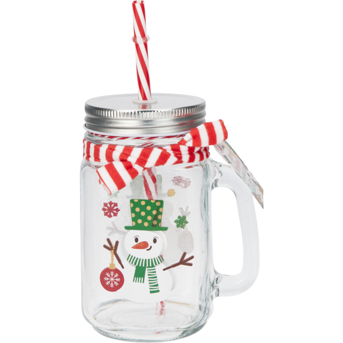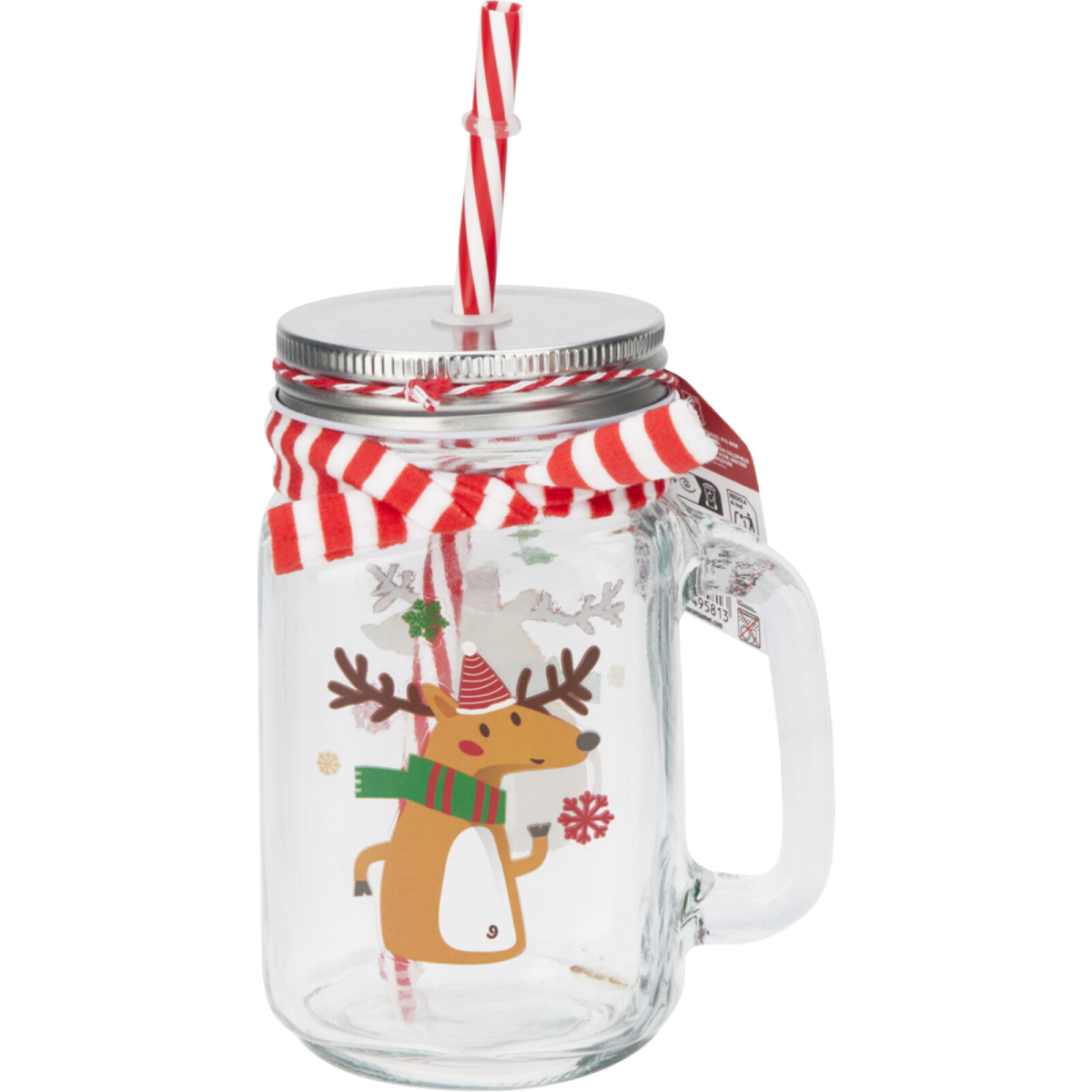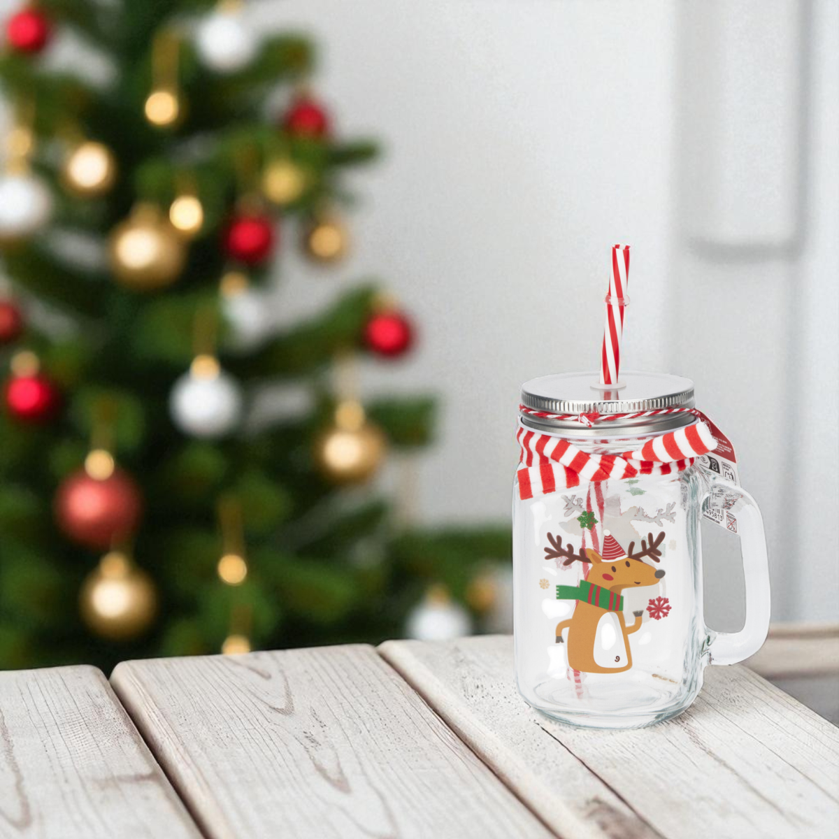 Vidám, ünnepi mintás pohár csavaros fémfedéllel és újrahasználható szívószállal. Praktikus a kiömlés csökkentésére, tökéletes forró-szobahőmérsékletű italokhoz és téli bulikra.