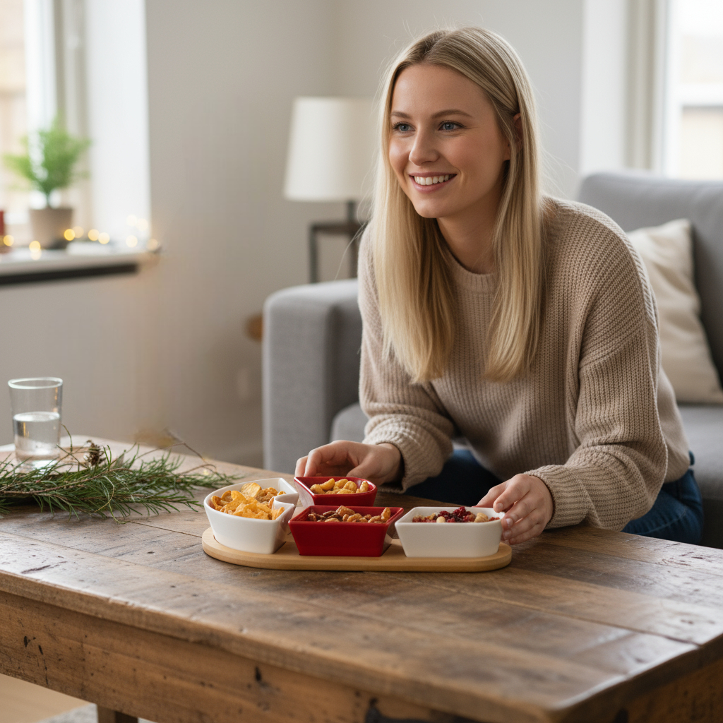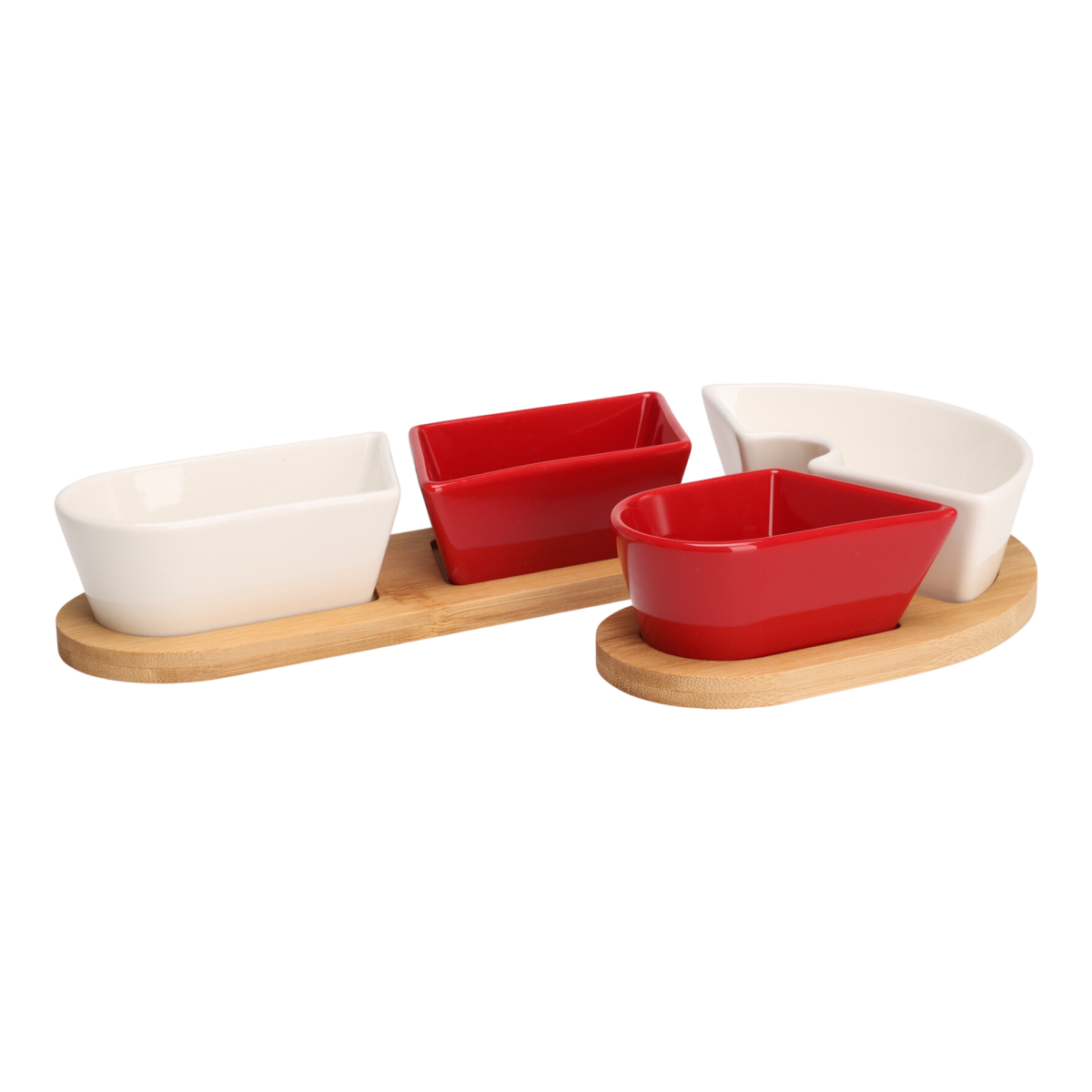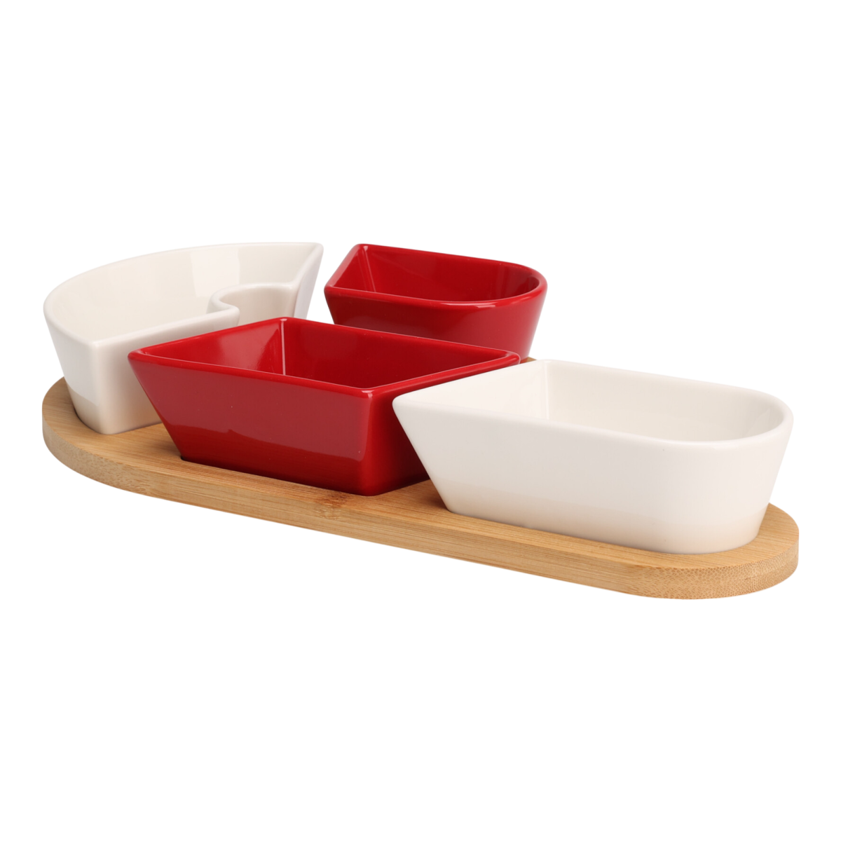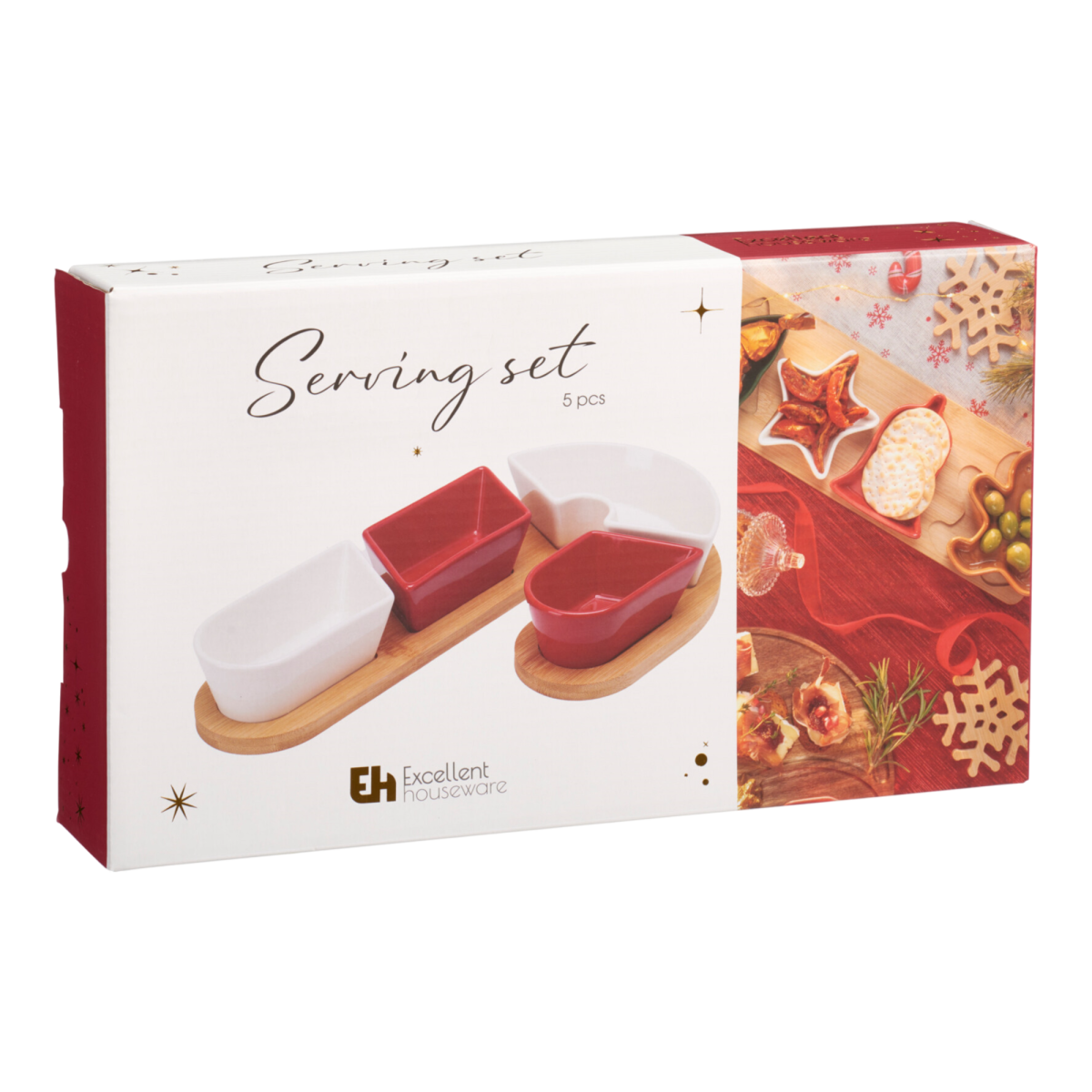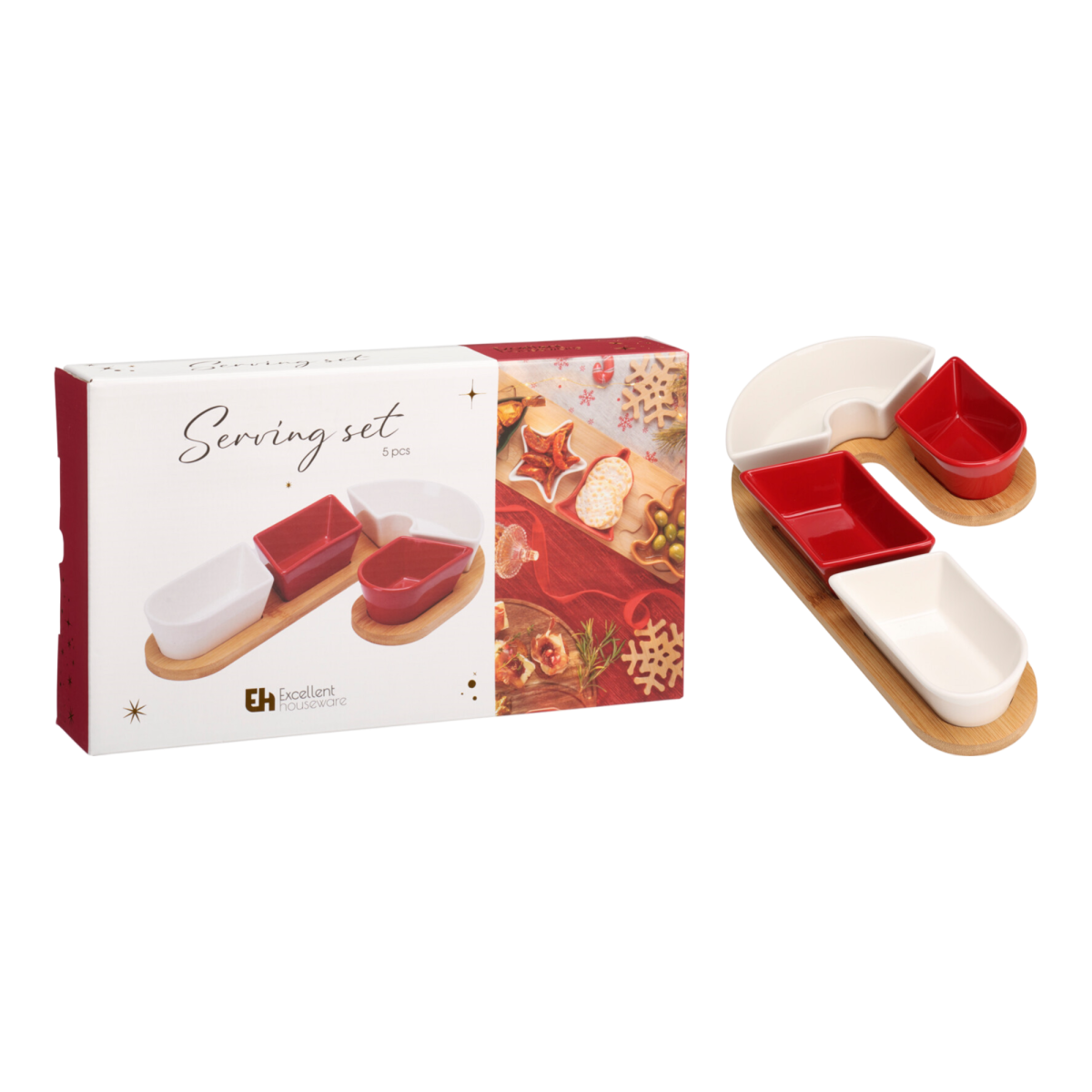Dobd fel az ünnepi asztalt ezzel az elegáns és praktikus tálaló készlettel! A természetes bambuszfa tálca és a piros-fehér kőporcelán tálkák harmonikus kombinációja nemcsak látványos, hanem rendkívül hasznos kiegészítő is. Ideális választás vendégváráshoz, karácsonyi vacsorákhoz, vagy ajándéknak egyaránt.