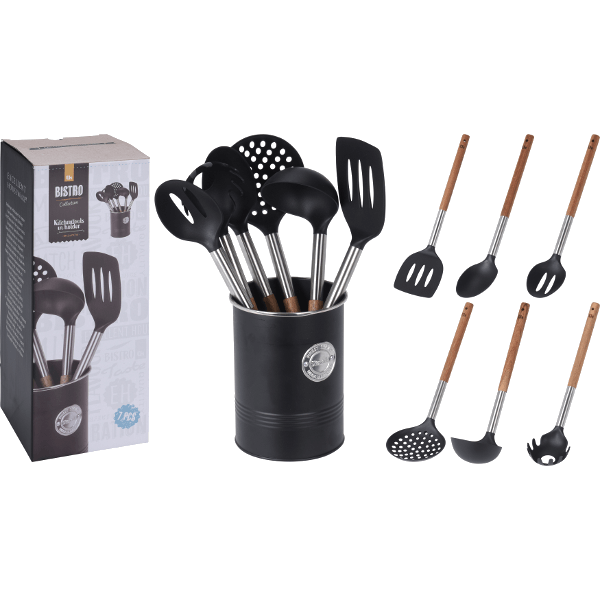 7 db/ szett:1 X tartó, fém, 120X120X170 MM, 1 X leveskanál, 1 X kiszedő, 1 X tálaló kanál, 1 X spagetti kanál, 1 X spatula, 1 X kiszedő kanál. Anyaga: fém
