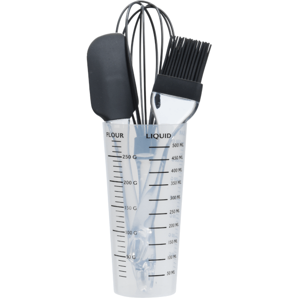 A szett tartalma: 500ml-es műanyag mérőpohár; 24,5cm-es spatula, anyaga polystyrene és szilikon; 28cm-es keverő, anyaga polystyrene és szilikon; 22cm-es ecset, anyaga polystyrene és szilikon.