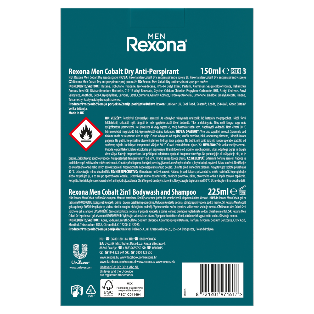 A Rexona Men Cobalt ajándékcsomag három egymást kiegészítő terméket kínál, amelyek a friss, energikus mindennapokat támogatják. A pezsdítő menta- és pézsmaillatú izzadásgátló aeroszol akár 48 órán át segít megőrizni a magabiztosságot, intenzív mozgás mellett is. A hűsítő tusfürdő és sampon felfrissíti a bőrt és a hajat, így már a reggeli rutin is lendületet adhat. Praktikus, sportos szett, amely ideális mindennapi használatra vagy ajándéknak is.
