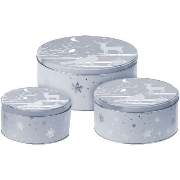 Sütemény tároló doboz. 3 db/ szett, ezüst színben, kicsi: 150X150X65 MM, közepes:185X185X75 MM, nagy: 200X200X85 MM, anyaga: fém.