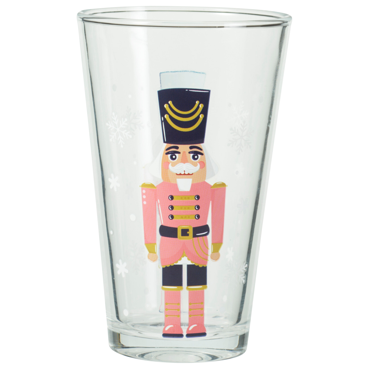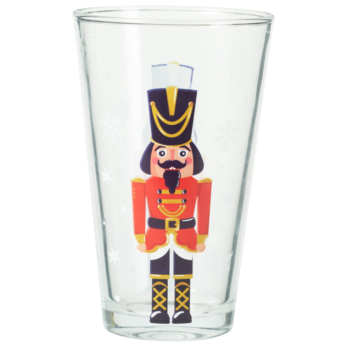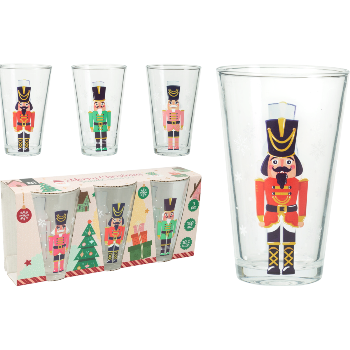Háromdarabos üveg pohár készlet karácsonyi diótörő figurákkal díszítve. A 300 ml-es űrtartalom és a kúpos forma hétköznapi italokhoz és ünnepi terítékhez is jól használható.