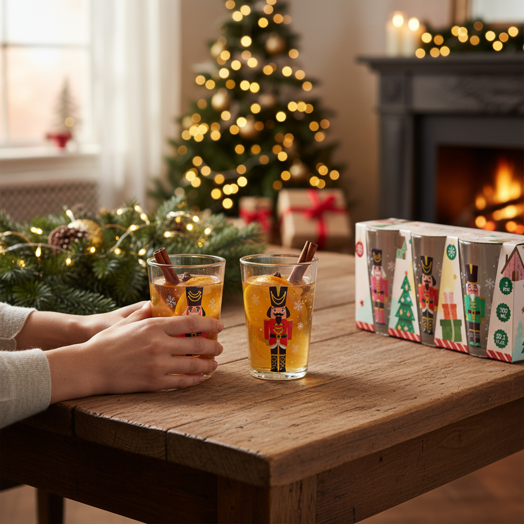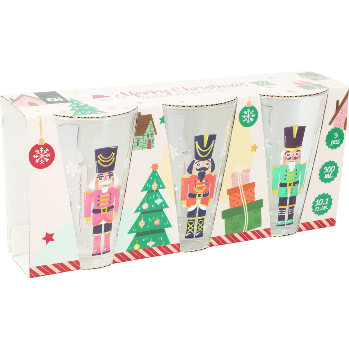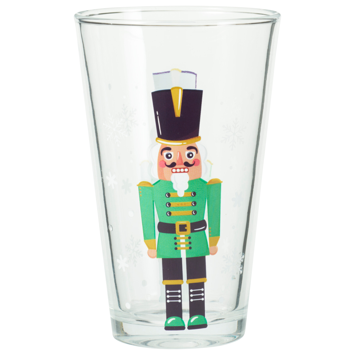 Háromdarabos üveg pohár készlet karácsonyi diótörő figurákkal díszítve. A 300 ml-es űrtartalom és a kúpos forma hétköznapi italokhoz és ünnepi terítékhez is jól használható.