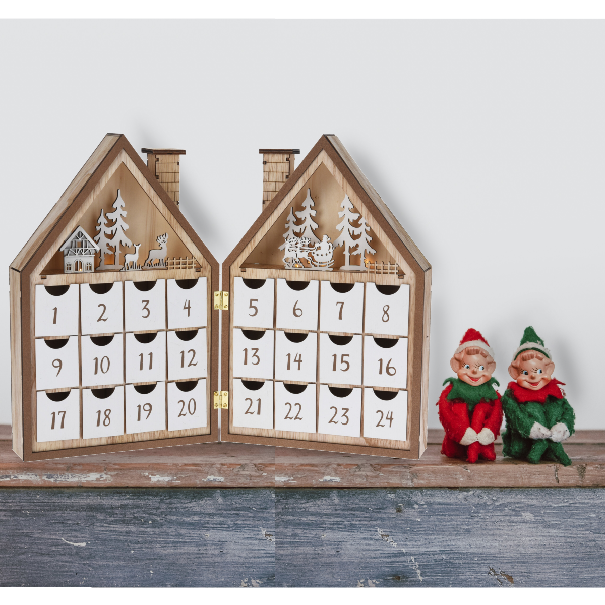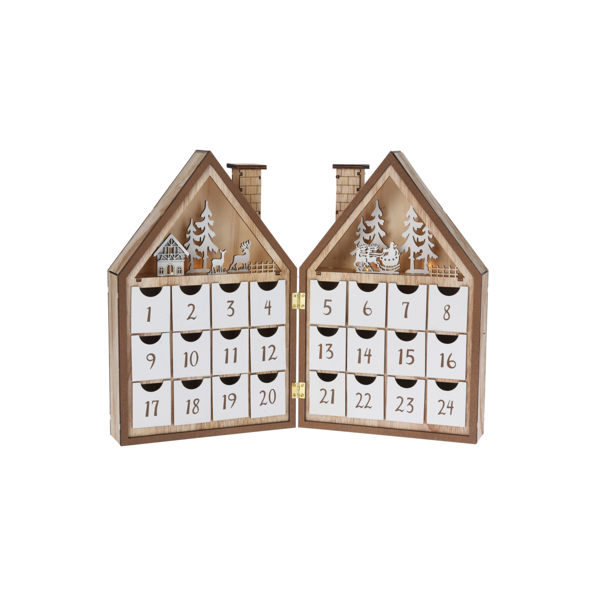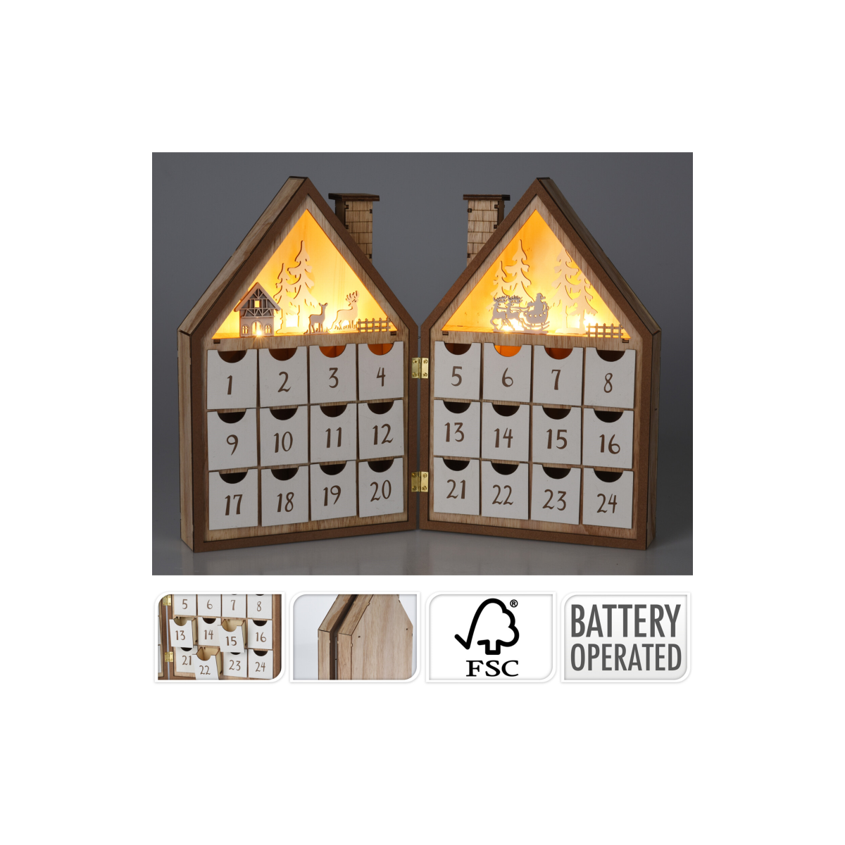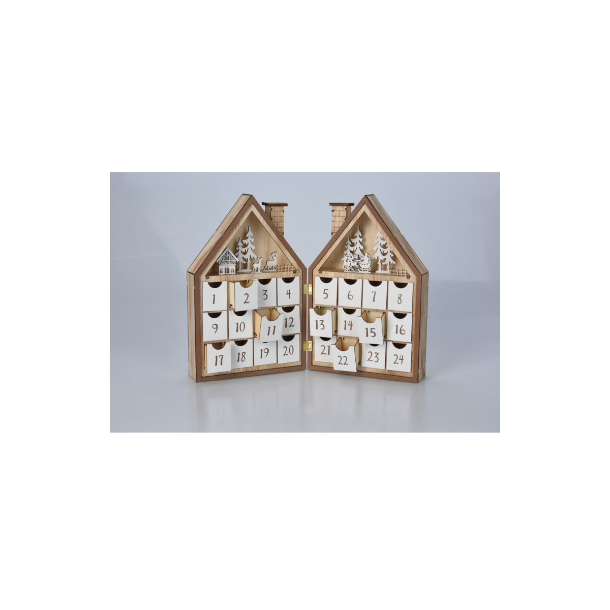 Fából készült adventi kalendárium LED világítással. Tökéletes választás a karácsonyi hangulat megteremtéséhez. 24 db kihúzható fa fiókkal rendelkezik, melybe apróbb ajándékokat lehet tenni, ezzel izgalmassá téve a karácsony előtti készülődést mind gyerekek és felnőttek számára. A 8 db meleg fehér LED meghitt hangulatot teremt a kalendárium köré. 2 db AAA elemmel működik, melyet a termék nem tartalmaz! Nem játék, csupán dekorációs célokra használható.