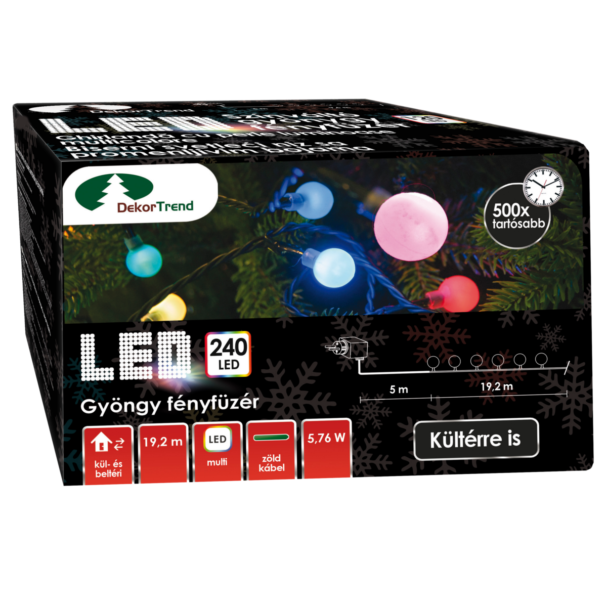 Gyöngy fényfüzér kül- és beltéri használatra, zöld színű kábellel, hideg fehér LED-ekkel, a fényfüzér 240 LED-et tartalmaz. Betápkábel hossza (m): 5, feszültség: 230 V, fogyasztás (W): 5,76 W, kábel: zöld, méret (m): 19,2, szigetelési osztály: IP44 (kül- és beltér) szín: multi