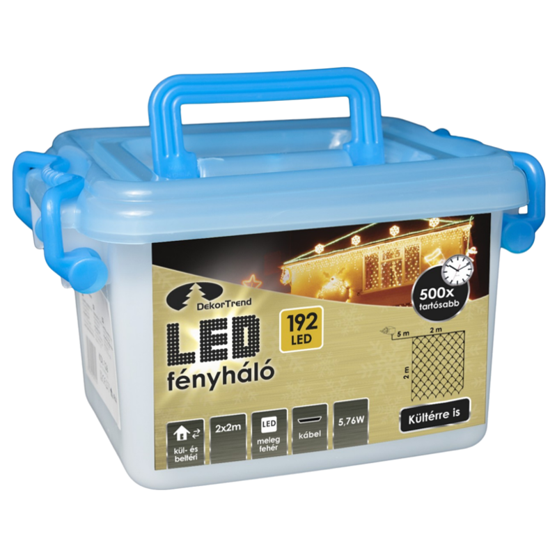 Led fényháló kül- és beltéri használatra 192 db meleg fehér led, 8 cm égők közti távolság, 5 m hosszú betápkábel trafóval, 2,0 x 2,0 m fényháló, fekete színű kábel.