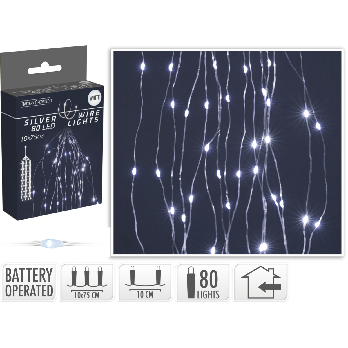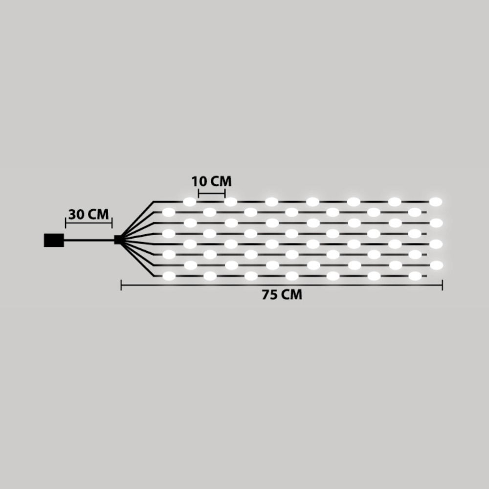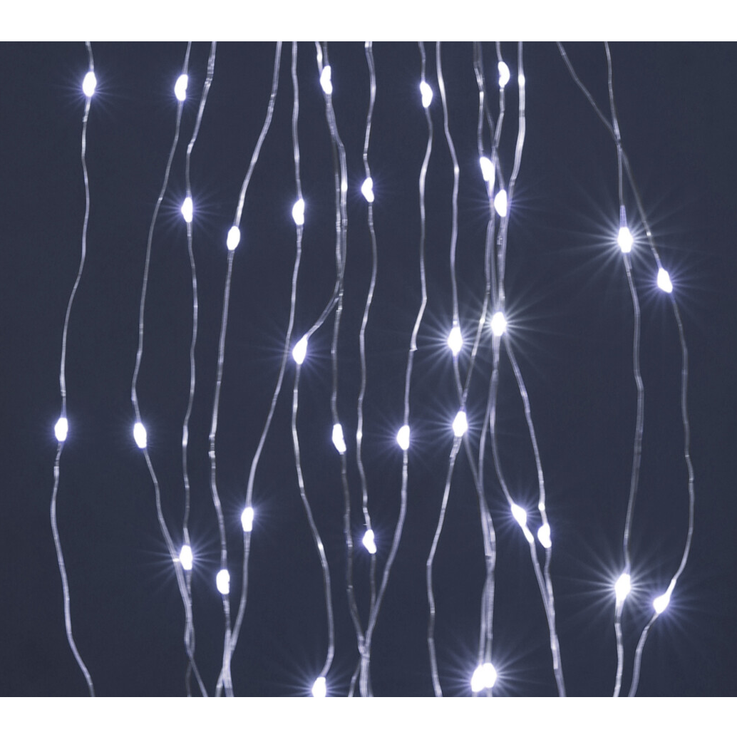 Dobja fel otthona hangulatát ezzel az egy pontból induló, 10 db 75 cm hosszú szálas beltéri fényfüzérrel. A kábel hossza 30 cm. 3 db AA elemmel működik, melyet a termék nem tartalmaz. A 80 db hideg fehér LED fényforrás tiszta és modern megjelenést biztosít a szobában. Tökéletesen alkalmas bármilyen ünnepi dekorációhoz vagy különleges alkalomhoz. A fényforrások egyenletesen, 10 cm távolságban helyezkednek el egymástól a 10 db szálon, így minden helyiséget varázslatossá tesznek.