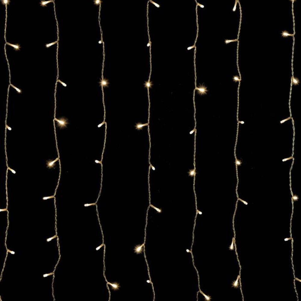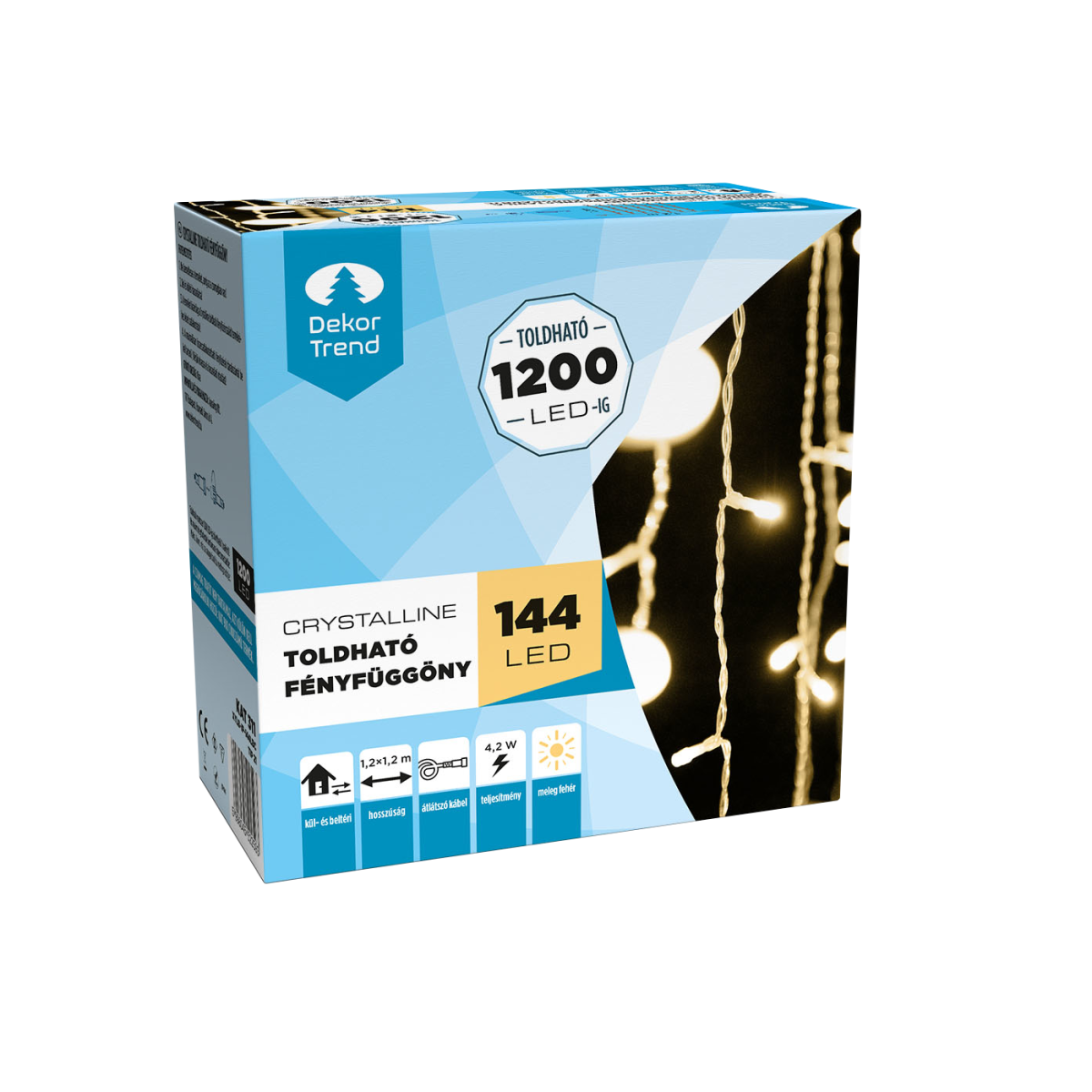Dekortrend Crystalline toldható fényfüggöny átlátszó kábellel, meleg fehér színben. Meseszép fényfüggöny átlátszó kábellel korlátok, falak és oszlopok dekorálására. A toldható rendszer lehetővé teszi, hogy akár 1200 LED-ig egybe kapcsoljunk több Crystalline terméket. A fényháló szálai ugyanolyan hosszúak, és egy központi kábelről lógnak le, ezért szabályos, egységes fényfal építhető belőle. Az átlátszó kábel alig észrevehető, a LED-ek fényei maximálisan érvényesülnek. Meleg fehér fénye kellemes, barátságos hangulatot teremt. A Dekortrend Crystalline LED fényfüzér család kiválóan alkalmas rendezvények, esküvők, kertek ünnepi vagy alkalmi díszítésére. IP44-es szigetelésének köszönhetően kültéren is használható. A Crystalline kültéri fényfüzér, fényháló, jégcsap fényfüzér és fényfüggöny szabadon egymásba toldható. A tápegység nem része a csomagnak, azt külön kell megvásárolni. 1200 LED-enként szükséges egy trafó beépítése.