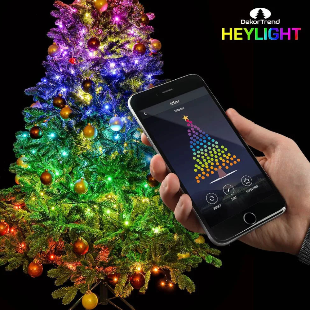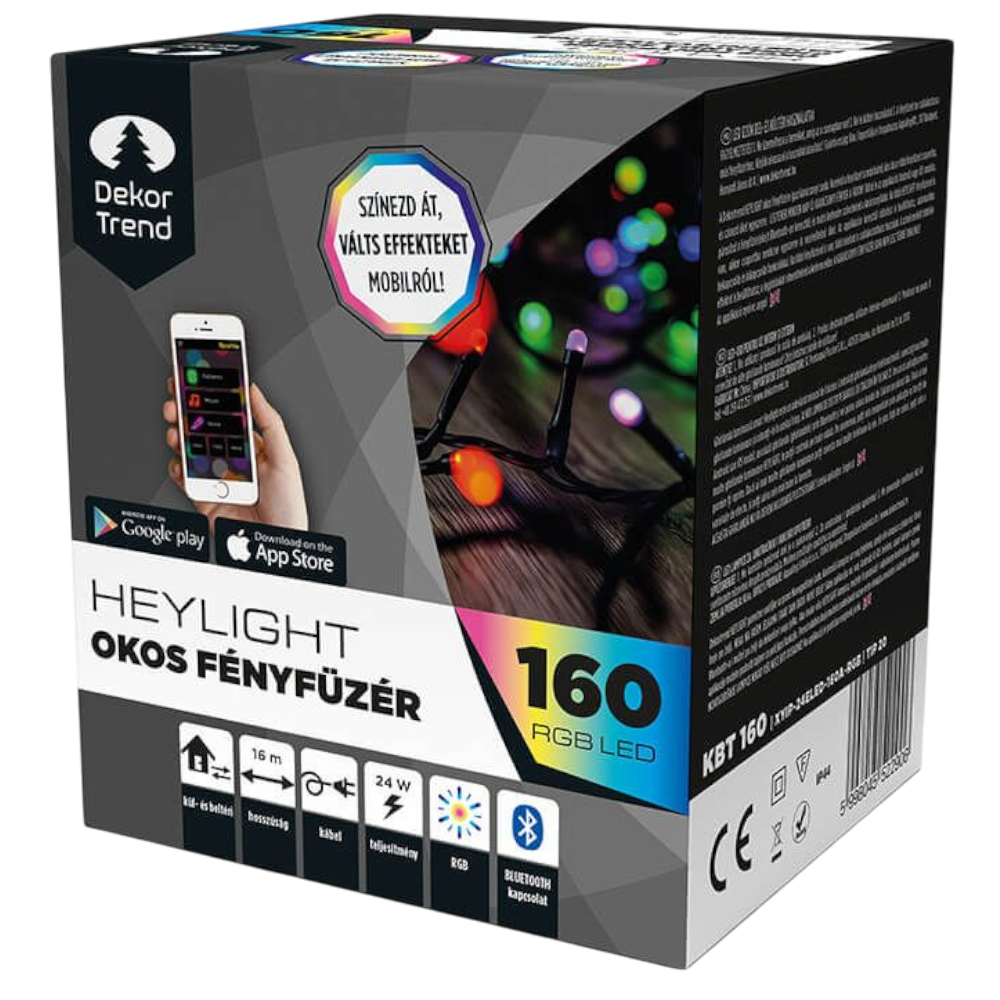 Dekortrend Heylight okos fényfüzér, 160 RGB LED, fekete kábel, 16 m + 3 m kábel A Dekortrend HEYLIGHT telefonnal vezérelhető fényfüzér, igazi karácsonyi csoda. Vezéreljük a fényfüzért a mobilról, kössünk össze több fényfüzért csoportba, és színezzük őket egyszerre. Legyenek minden nap új karácsonyi fények a fán! Töltsük le az applikációt Android vagy iOS mobilra, párosítsd a fényfüzér(eke)t Bluetooth-on keresztül, és máris kedvedre színezheted a karácsonyfádat. https://apps.apple.com/us/app/heylight/id1454998115 https://play.google.com/store/apps/details?id=com.sunlayheylight&hl=en Ha több HEYLIGHT fényfüzérünk is van, akkor csoportba rendezve egyszerre is vezérelhetjük őket. Az applikáción keresztül időzítést is beállíthatunk, automatikus bekapcsolás és kikapcsolás funkciókkal. Ha több fényfüzérünk is van, több telefont is csatlakoztathatunk hozzájuk. A színek mellett többféle effektet is beállíthatunk, a legjobbakat elmenthetjük a kedvencekbe. A karácsonyi fényfüzér soha nem lesz többé unalmas! Az applikáció nyelve: angol Kapcsolat: Bluetooth A kábelen található vezérlővel is irányítható, mobil applikáció nélkül is. S gomb – színválasztás 10-féle szín közül: piros, zöld, kék, sárgászöld, tengerkék, ibolya, borostyán, türkiz, lila, pink F gomb – funkció 14-féle program közül: színes hóesés, színváltós-villanós, színváltós futófény, piros csillagok, kék csillagok, zöld csillagok, kék-piros változó, piros-kék változó, piros futófény, kétszínű kígyózó, színváltó pulzáló, multikolor hóesés, piros építkezős, karnevál Újraindítás: F gomb nyomva tartva 7 mp-ig. Mobil applikáció funkciók: effekt-választás színbeállítás sebesség beállítás csoportba rendezés időzítés kedvencek effekt megosztás