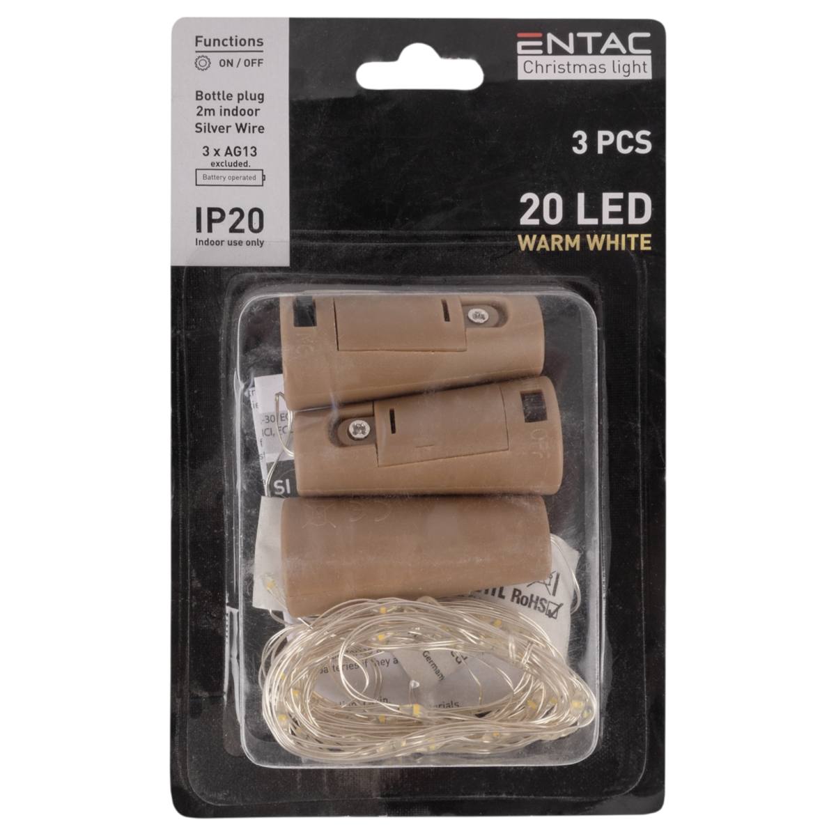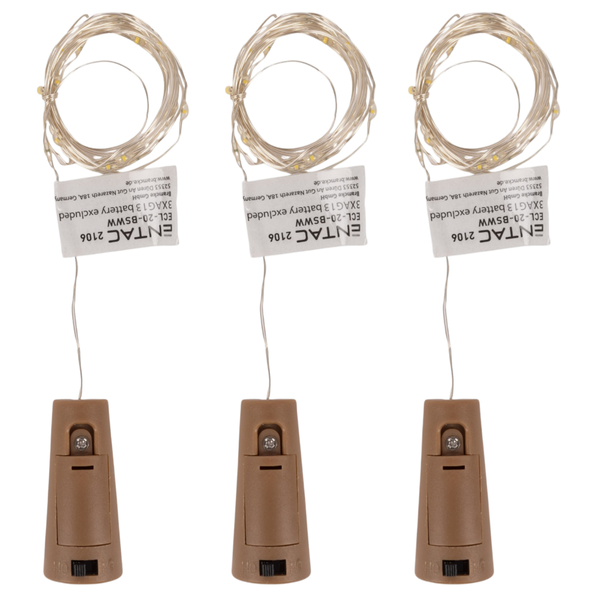 Az Entac LED 3 darabos drótfüzér szett praktikus palackdugós kialakításával és melegfehér fényeivel könnyedén különleges hangulatot teremt otthonodban vagy rendezvényeiden. Elemes működésének köszönhetően kötöttség nélkül, bárhol elhelyezhető.