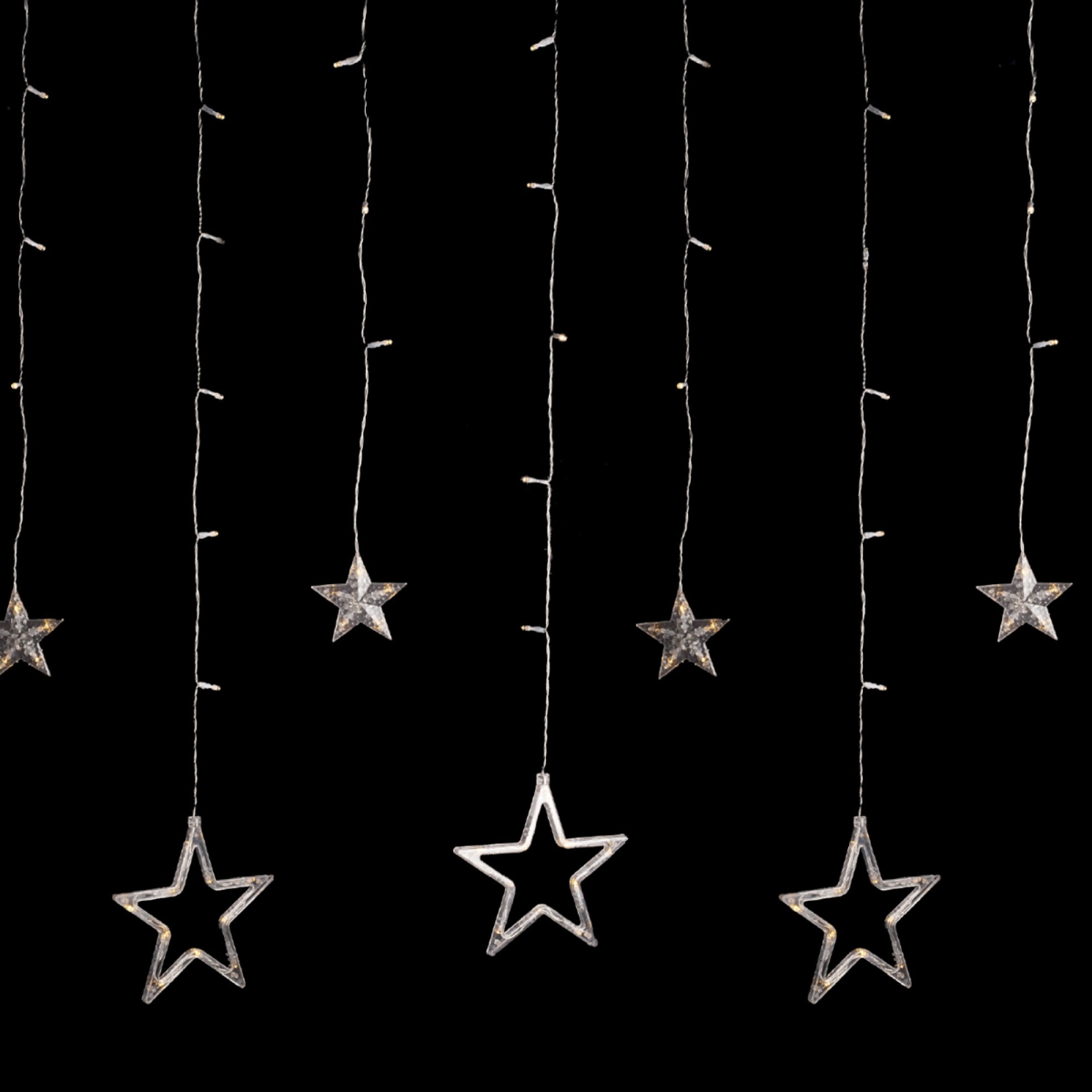 A 138 LED-ből álló rendszer és a 12 dekoratív csillag harmonikus elrendezést alkot – tökéletes háttérként szolgálhat ünnepi alkalmakhoz vagy meghitt mindennapokhoz. A 2 méter széles és 1 méter magas függönyhossz, valamint az 5 méteres tápkábel rugalmas elhelyezést tesz lehetővé, akár beltéren, akár kültéren.