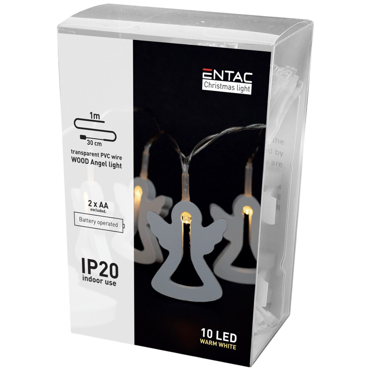 Az Entac angyalsziluettes fényfüzér melegfehér fényeivel és kedves, fa angyal formáival egyedi dísze lehet ablaknak, falnak vagy polcnak. Elemes működése révén bárhol könnyedén elhelyezhető – konnektor nélkül is.