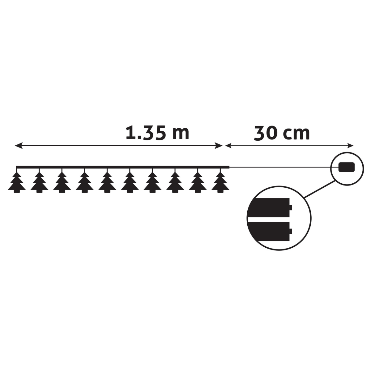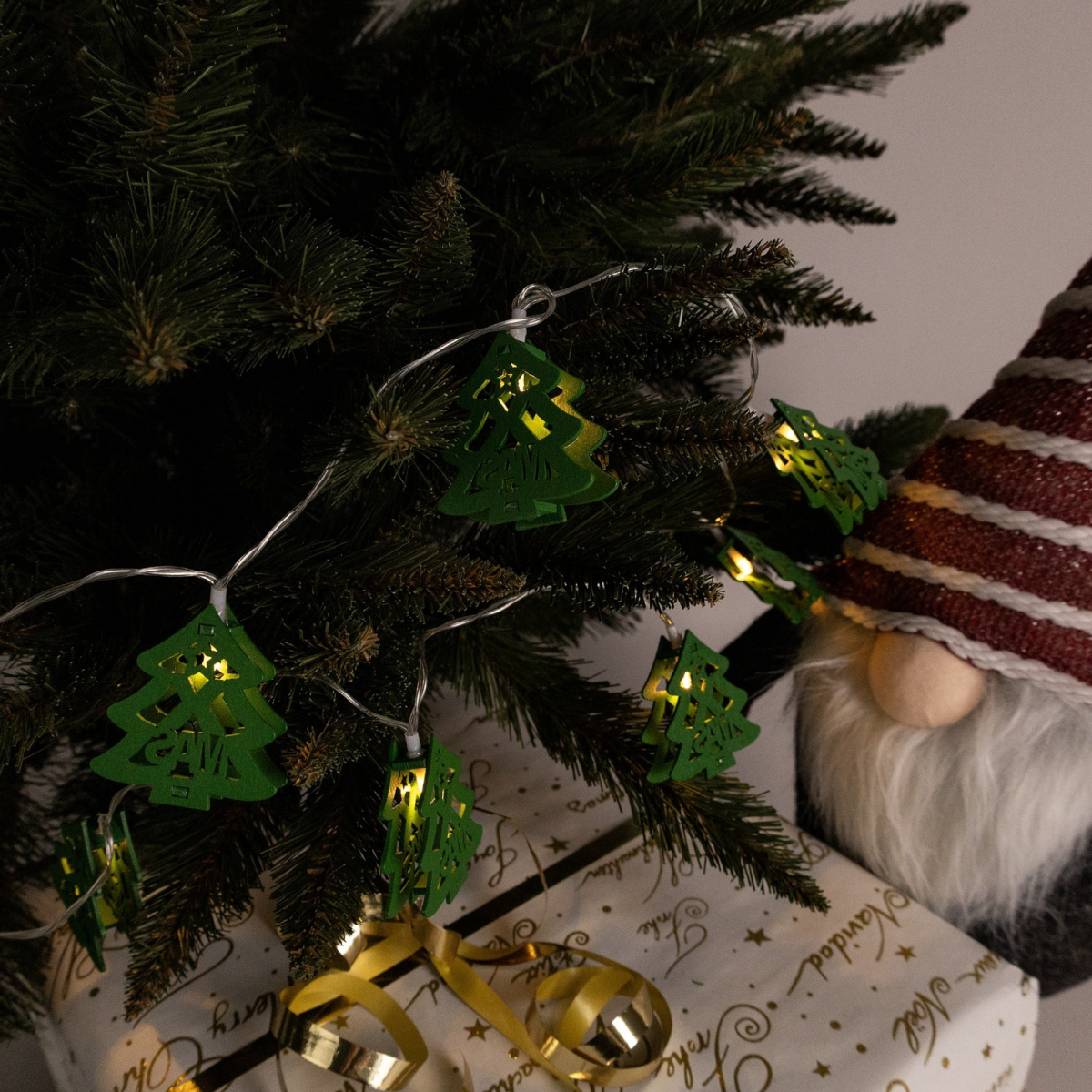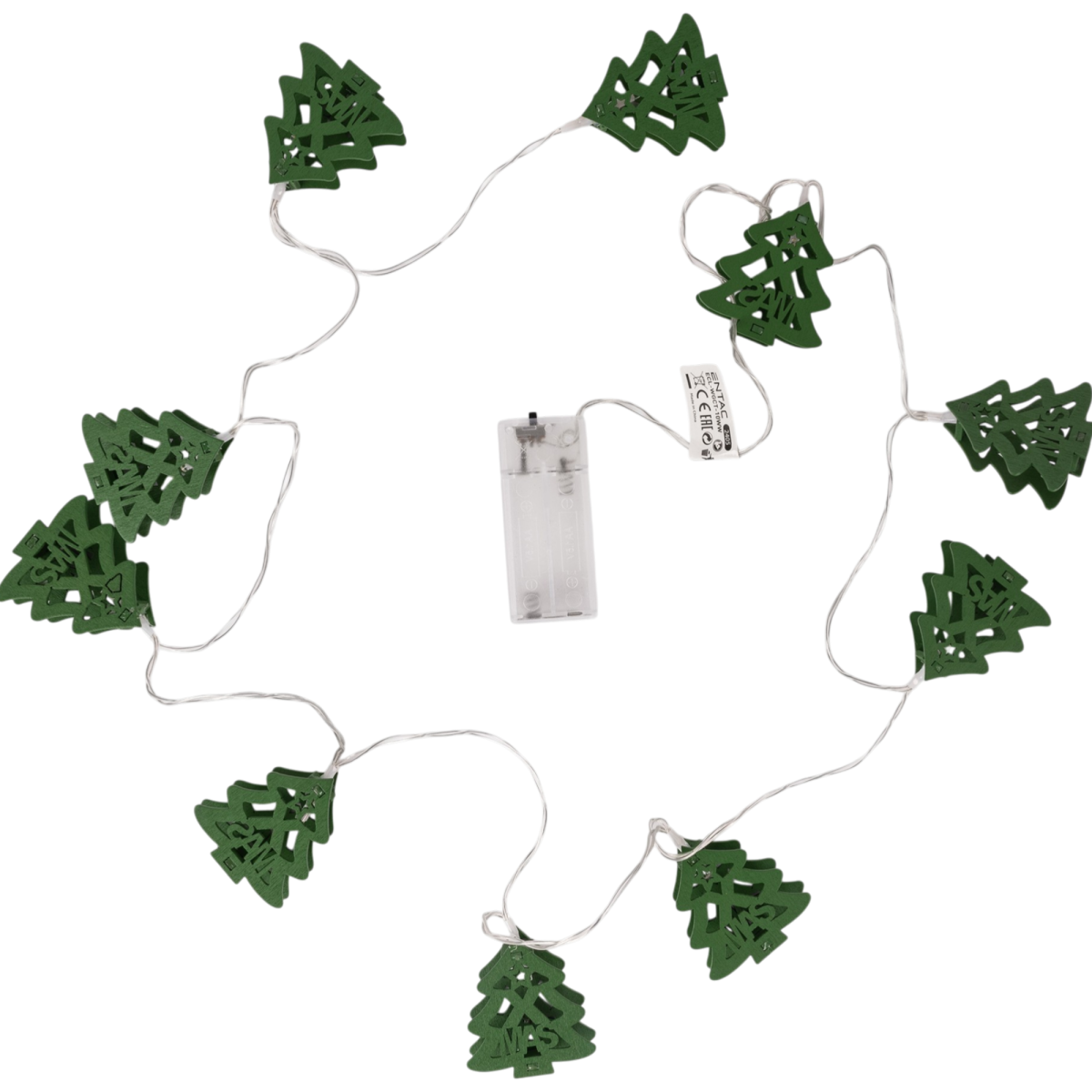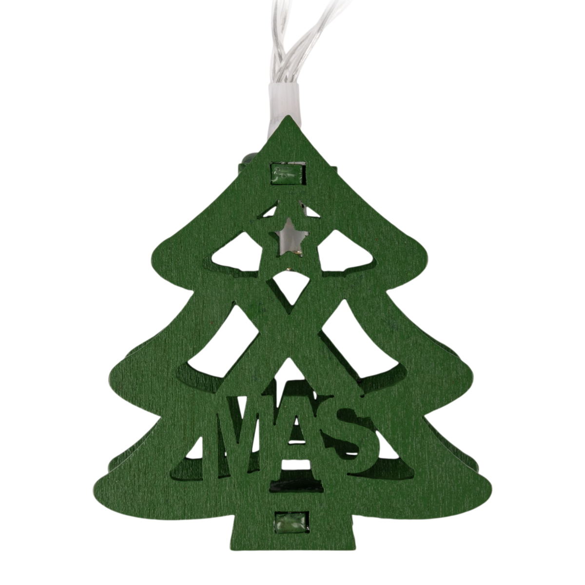 Varázsolj ünnepi hangulatot otthonodba ezzel a melegfehér fényű LED fényfüzérrel, amelyet zöld, „XMAS” feliratos karácsonyfa alakzatok díszítenek.