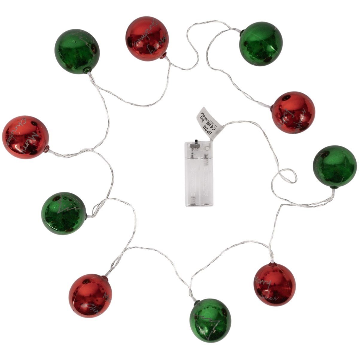 A piros és zöld gömbök melegfehér fénnyel világítanak, míg a változatos feliratok és motívumok karakteressé teszik a dekorációt. Elemes működésének köszönhetően bárhová elhelyezhető, nem szükséges hálózati csatlakozás hozzá.
