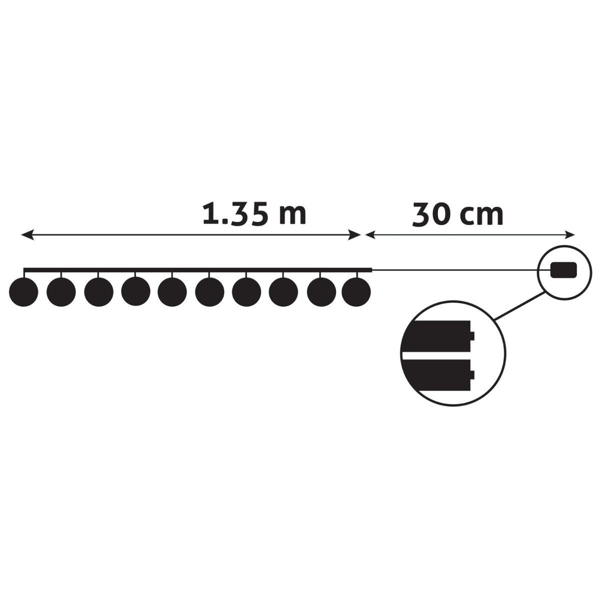 ✅ 1,35 m hosszú füzér + 30 cm betáp kábel – kompakt kialakítás