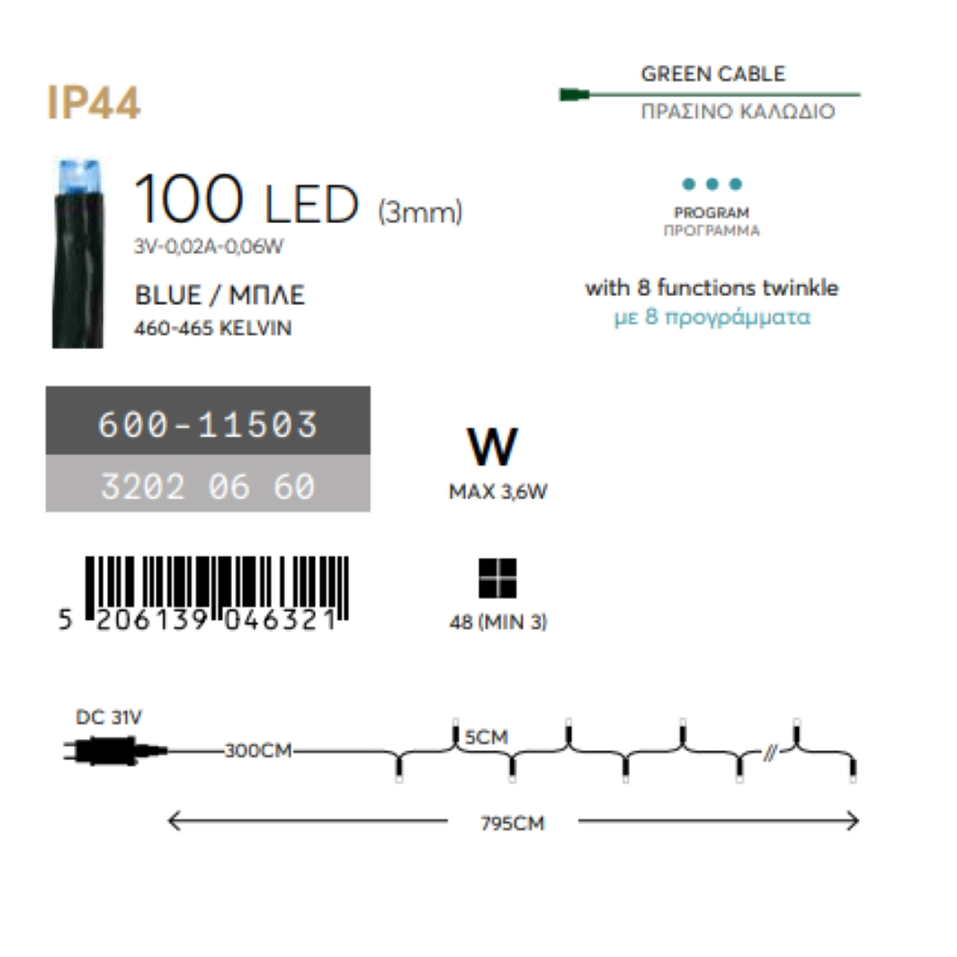 Az Eurolamp innovatív fényfüzére kiválóan alkalmas különböző rendezvények, családi ünnepek kiegészítő dekorálására. A 100 db kék LED mesébe illő hangulatot áraszt karácsonykor, de akár az év többi napján is otthon, vagy más feldíszített környezetben. A 4,95 méter hosszú fénysoron elhelyezkedő LED izzók közötti távolság csak 5 cm, ami tovább növeli a fényfüzér hangulatának és színeinek intenzitását. A fényfüzér adapterén lévő gomb segítségével 8 különböző fényjáték közül választhat, még szebbé téve a meghitt pillanatokat. Kültéren és beltéren egyaránt használható az IP44 védelemnek köszönhetően. Az IP44 védelem miatt a fényfüzért kültéren csak fedett helyen használja, ahol csapadék közvetlen nem éri. A tápegység tartozéka a doboznak. A tápvezeték hossza 3 méter.