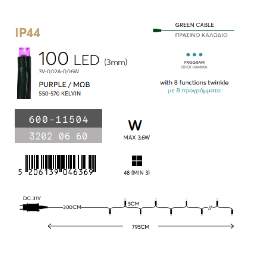 Az Eurolamp innovatív fényfüzére kiválóan alkalmas különböző rendezvények, családi ünnepek kiegészítő dekorálására. A 100 db lila LED mesébe illő hangulatot kölcsönöz otthonába és karácsonykor, akár az év többi napján is kellemes hangulatot áraszt környezetében. A 4.95 méter hosszú fénysoron elhelyezkedő LED izzók közötti távolság csak 5 cm, így tovább növeli a fényfüzér hangulatának és színeinek intenzitását. A fényfüzér adapterén lévő gomb segítségével 8 különböző fényjáték közül választhat, még szebbé téve a meghitt pillanatokat. Kültéren és beltéren egyaránt használható az IP44 védelem miatt. Az IP44 védelem miatt a fényfüzért kültéren csak fedett helyen használja, ahol csapadék közvetlen nem éri. A tápegység tartozéka a doboznak. A tápvezeték hossza 3 méter.