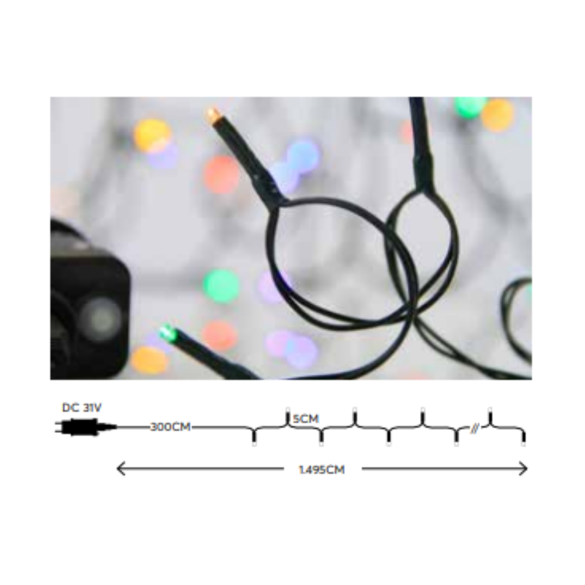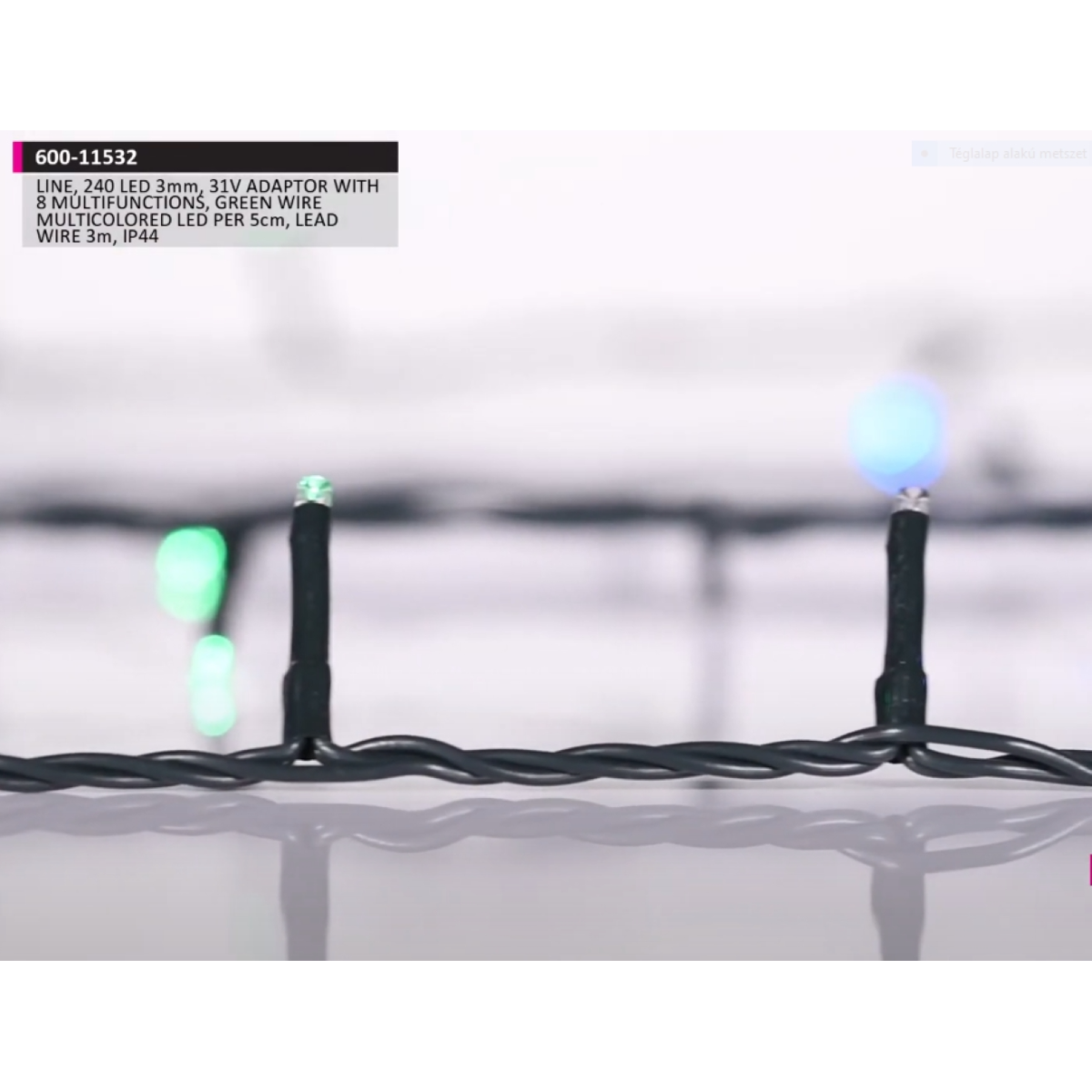 Az Eurolamp innovatív fényfüzére kiválóan alkalmas különböző rendezvények, családi ünnepek kiegészítő dekorálására. A 240 db színes LED karácsonykor, de akár az év többi napján is kellemes, mesébe illő hangulatot áraszt otthon vagy más feldíszített környezetben. A 11,95 méter hosszú fénysoron elhelyezkedő LED izzók közötti távolság csak 5 cm, ami tovább növeli a fényfüzér hangulatának és színeinek intenzitását. A fényfüzér adapterén lévő gomb segítségével 8 különböző fényjáték közül választhat, még szebbé téve a meghitt pillanatokat. Kültéren és beltéren egyaránt használható az IP44 védelemnek köszönhetően. Az IP44 védelem miatt a fényfüzért kültéren csak fedett helyen használja, ahol csapadék közvetlen nem éri. A tápegység tartozéka a doboznak. A tápvezeték hossza 3 méter.