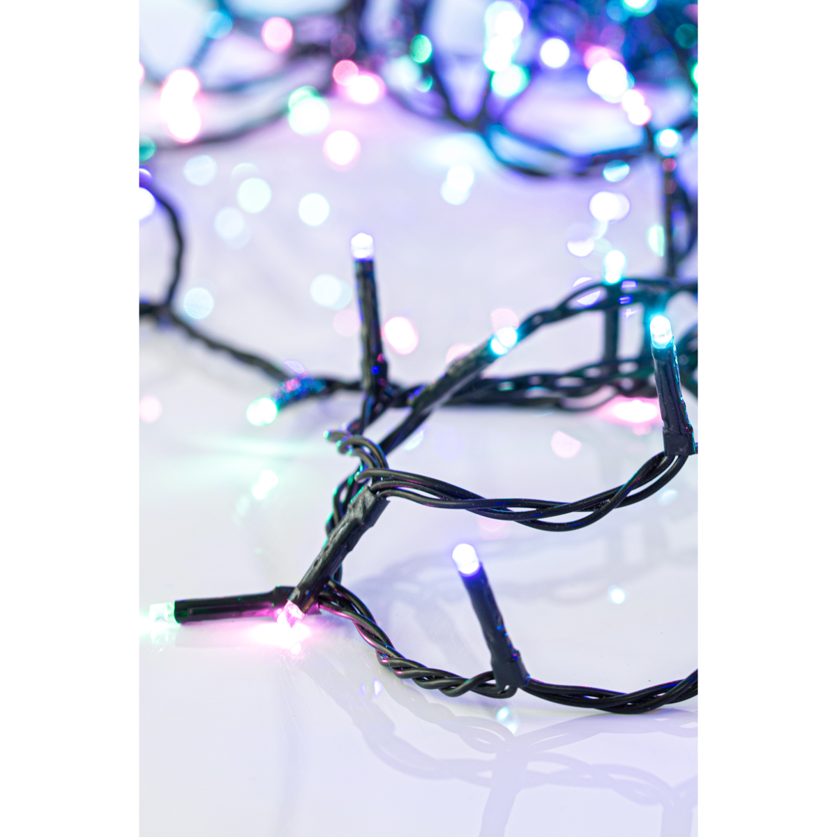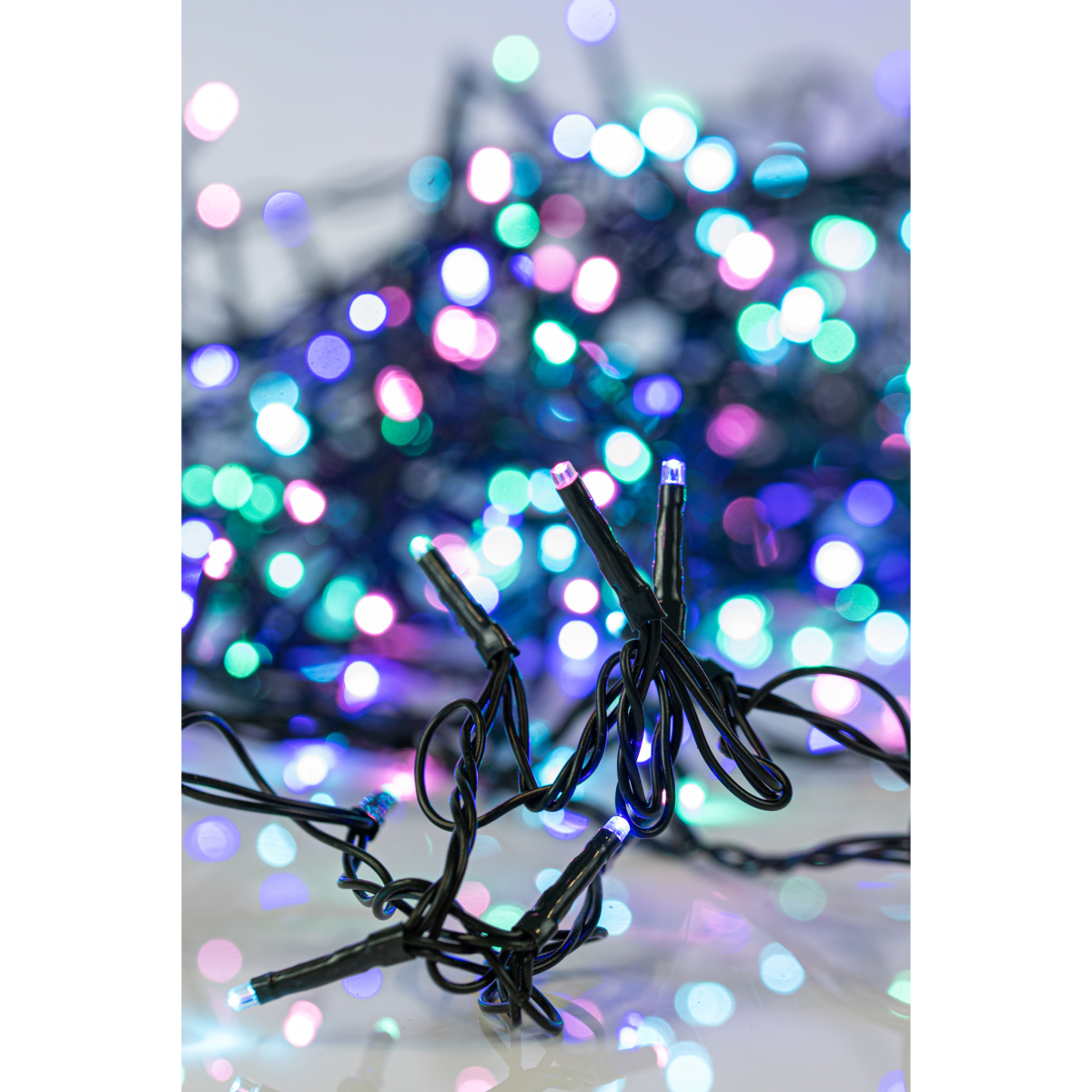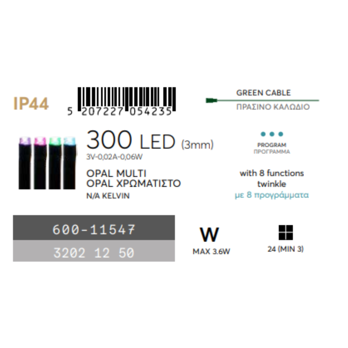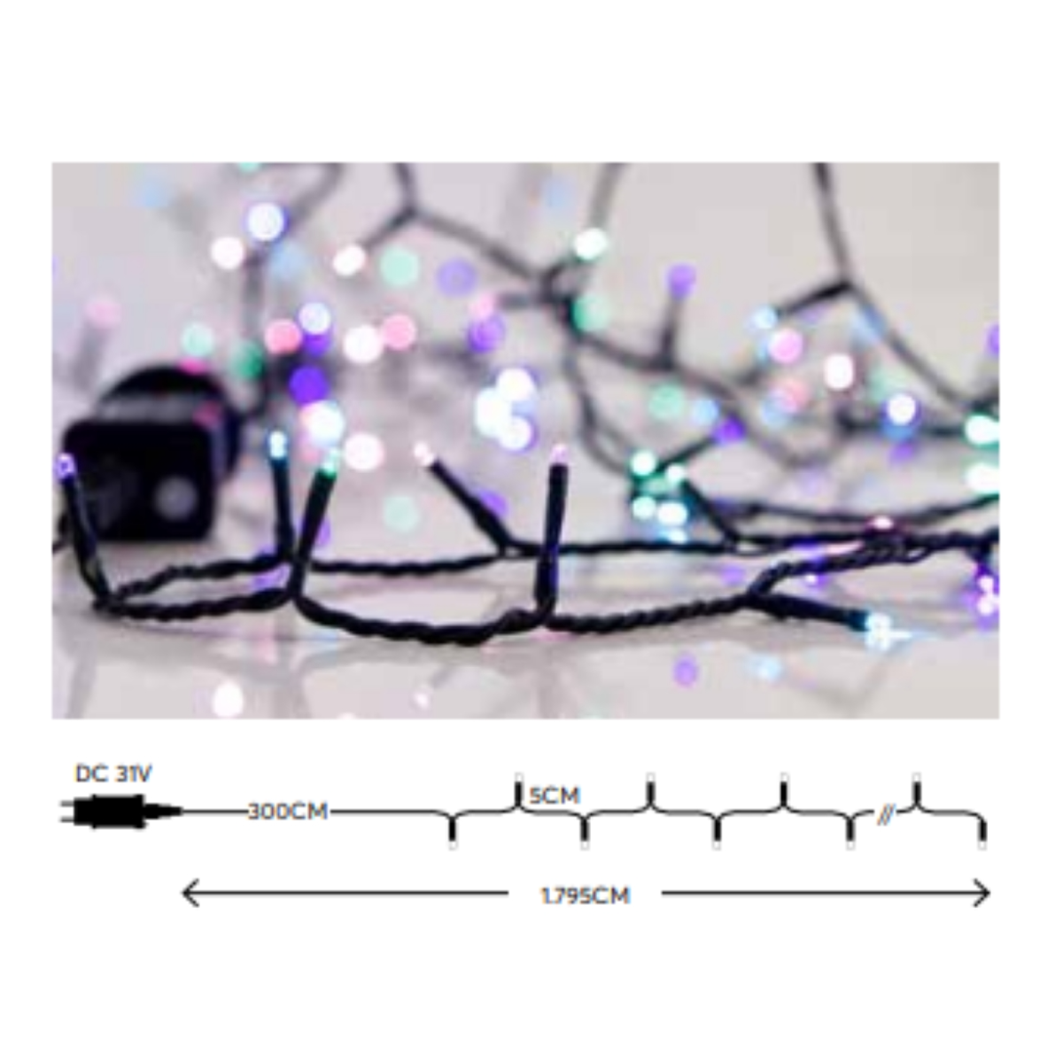 Az Eurolamp innovatív fényfüzére kiválóan alkalmas különböző rendezvények, családi ünnepek kiegészítő dekorálására. A 300 db opál színes LED mesébe illő hangulatot kölcsönöz otthonába és karácsonykor, akár az év többi napján is kellemes hangulatot áraszt környezetében. A 14.95 méter hosszú fénysoron elhelyezkedő LED izzók közötti távolság csak 5 cm, így tovább növeli a fényfüzér hangulatának és színeinek intenzitását. A fényfüzér adapterén lévő gomb segítségével 8 különböző fényjáték közül választhat, még szebbé téve a meghitt pillanatokat. Kültéren és beltéren egyaránt használható az IP44 védelem miatt. Az IP44 védelem miatt a fényfüzért kültéren csak fedett helyen használja, ahol csapadék közvetlen nem éri. A tápegység tartozéka a doboznak. A tápvezeték hossza 3 méter.