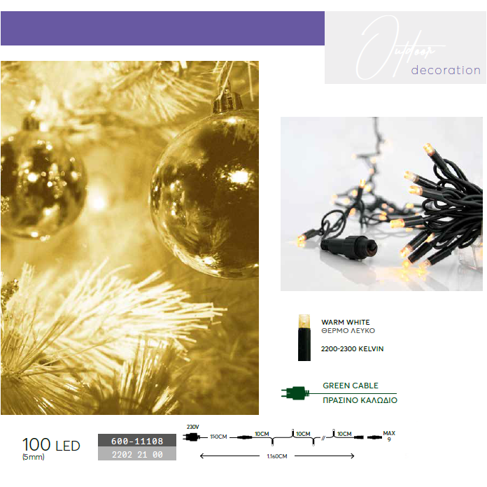 A Eurolamp kifejezetten kültérre kifejlesztett, innovatív, bővíthető fényfüzérei kiválóan alkalmasak szabadban lévő rendezvények, családi ünnepek kiegészítő dekorálására. A fényfüzér akár 100 méterig is bővíthető a fénysorok egymásba kapcsolásával.
