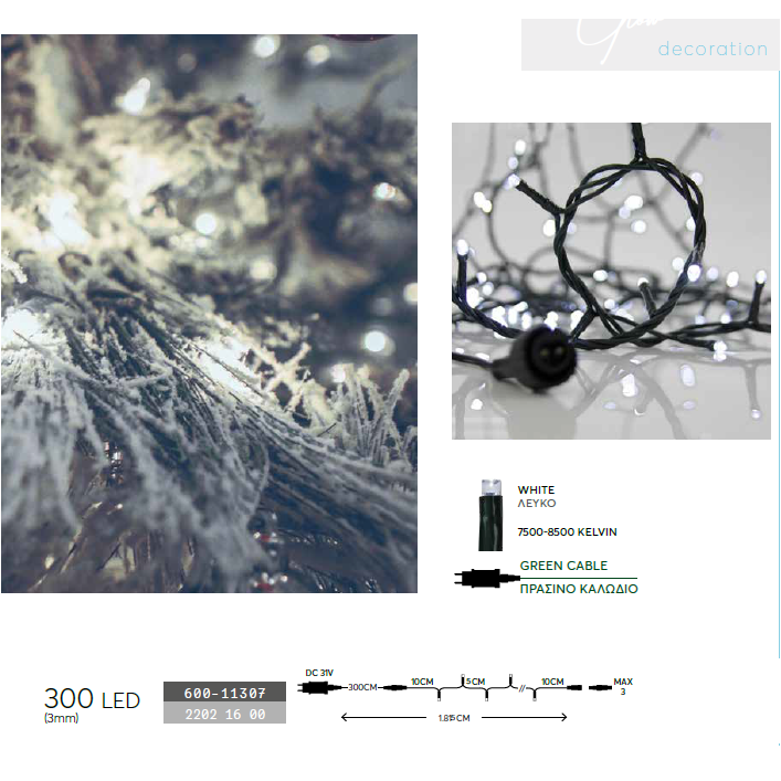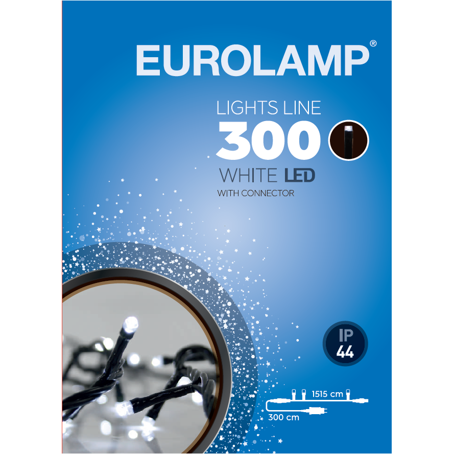 A Eurolamp innovatív, bővíthető fényfüzérek kiválóan alkalmasak különböző rendezvények, családi ünnepek kiegészítő dekorálására. Kültéren és beltéren egyaránt használható az IP44 védelem miatt. Bővíthetőségének köszönhetően 300-900 Led számig toldhatók a szettek. Az izzók távolsága 5cm, mely sokkal szebb megjelenést nyújt. A 300 LED-es izzósor hossza 15,15 méter (tápkábel nélkül). A tápkábel hossza 3 m. A doboz tartalmazza a transzformátort (tápegység), a tápkábelt és a Led izzósort.