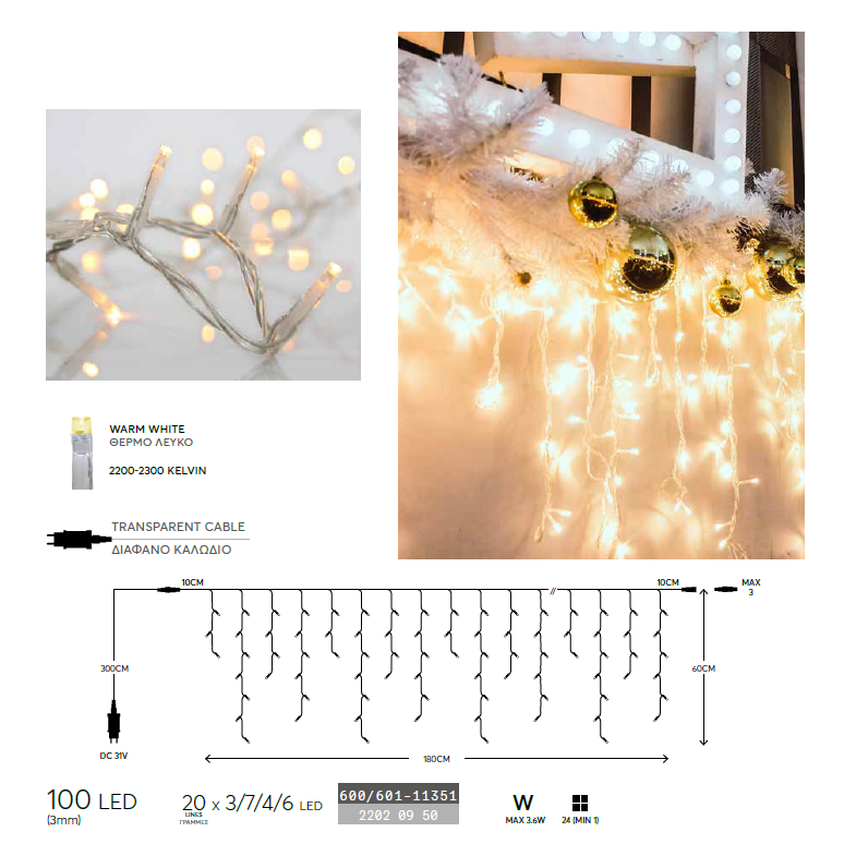 A Eurolamp innovatív, bővíthető jégcsapfüzérei kiválóan alkalmasak különböző rendezvények, családi ünnepek kiegészítő dekorálására. Mesébe illő hangulatot kölcsönöz otthonában, amely akár karácsonykor, akár az év többi napján is kellemes hangulatot áraszt környezetében. Kültéren és beltéren egyaránt használható az IP44 védelem miatt. Bővíthetőségének köszönhetően 100-300 Led számig tudjuk toldani a szetteket. A jégcsapok hosszúsága különböző, a vezeték színe átlátszó, mely sokkal szebb megjelenést nyújt. A 100 LED-es jégcsapfüzér hossza 180 cm ( tápkábel nélkül), a leghosszabb jégcsap hossza függőleges irányban 60 cm. A tápkábel hossza 3 m. A doboz tartalmazza a transzformátort (tápegység), a tápkábelt és a Led izzósort. Fontos, hogy a tápegység tartozéka a doboznak! Nem kell külön megvásárolni. Így egyik évben például különböző helyeken használja fel a 100 LED-es fényfüzért, míg más alkalommal bővíthetőségének köszönhetően akár 3-szor hosszabb jégcsapfüzért is kialakíthat a sorok összekapcsolásával.