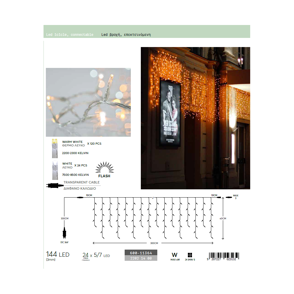 Kültéren és beltéren egyaránt használható az IP44 védelem miatt. Ledek száma összesen 144 darab, melyből 120 LED folyamatosan világít és meleg fehér színű. 24 LED pedig Flash LED, villog és hideg fehér fényű. Bővíthetőségének köszönhetően 432 Led számig bővíthetők a szetteket. A jégcsapok hosszúsága különböző, a vezeték színe átlátszó. A 144 LED-es jégcsapfüzér hossza 300cm (tápkábel nélkül), a leghosszabb jégcsap hossza függőleges irányban 60cm. A tápkábel hossza 3m. A doboz tartalmazza a transzformátort (tápegység), a tápkábelt és a Led izzósort.