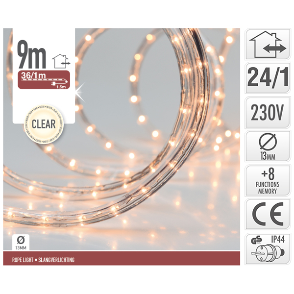 Varázsold ünnepi hangulatba otthonodat ezzel a gyönyörű kültéri karácsonyi fényfüzérrel! A ragyogó fények tökéletesen kiegészítik a karácsonyi dekorációt, és meghittséget hoznak. Egyszerűen használható így gondtalanul élvezheted az ünnepi fényeket! Huzal világítás, meleg fehér LED-es, hossza 9 méter, átmérő : 12 mm.1,5 m vezeték. Keresztmetszet 2x1 mm2, méterenként 24 LED. 3V/20mA, IP44 GS/NEMCO. 8 funkciós vezérlőkapcsolóval.