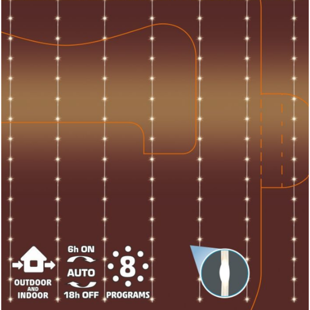 Ez a 2×2 méteres fényfüggöny melegfehér fényeivel kellemes, meghitt hangulatot teremt otthonodban vagy a kertben. A 200 LED-es kialakítás egyenletes fényeloszlást biztosít, míg a 8 különböző világítási mód és a beépített időzítő funkció segít a dekoráció személyre szabásában. Az IP44-es adapternek köszönhetően kültéren is biztonságosan használható.