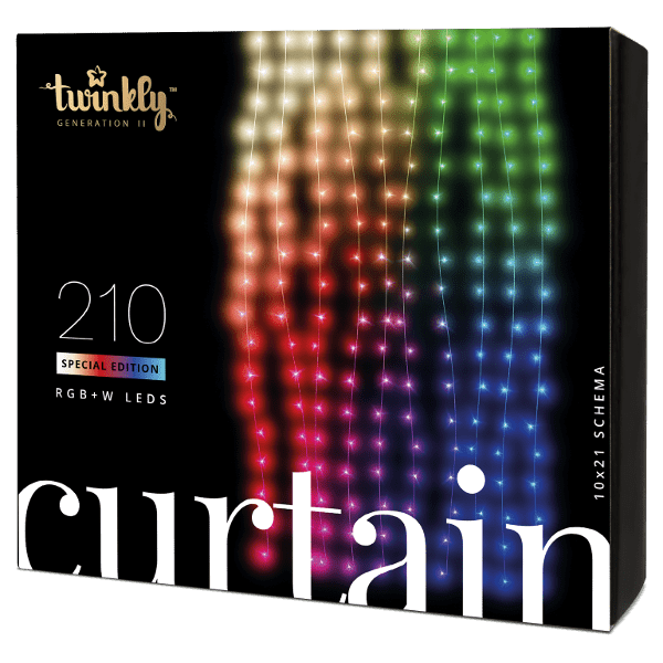 Twinkly Fény-Függöny 210 LED matt és tiszta izzóval RGBW fehérszínhatású, 5m*70cm 5mm lapos ízzókkal, 10 soron, soronként 10 ízzóval, 2,1 méteres átlátszó kábellel, 10 cm-es lámpa-távolság, BT + WiFi, Gen II, IP44 védettség.