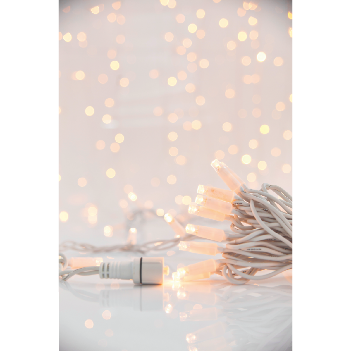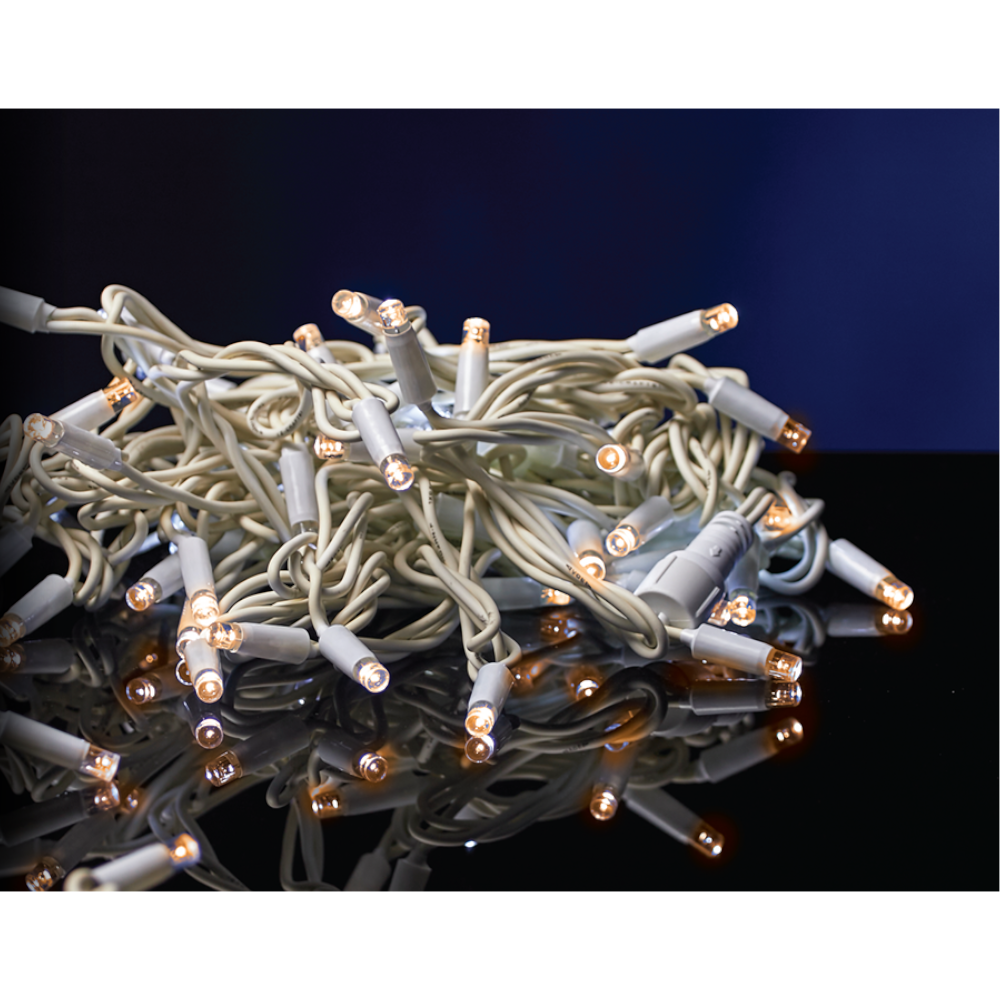 Ez a 100 db melegfehér LED-del ellátott fényfüzér hangulatos világítást biztosít ünnepi vagy mindennapi dekorációhoz.