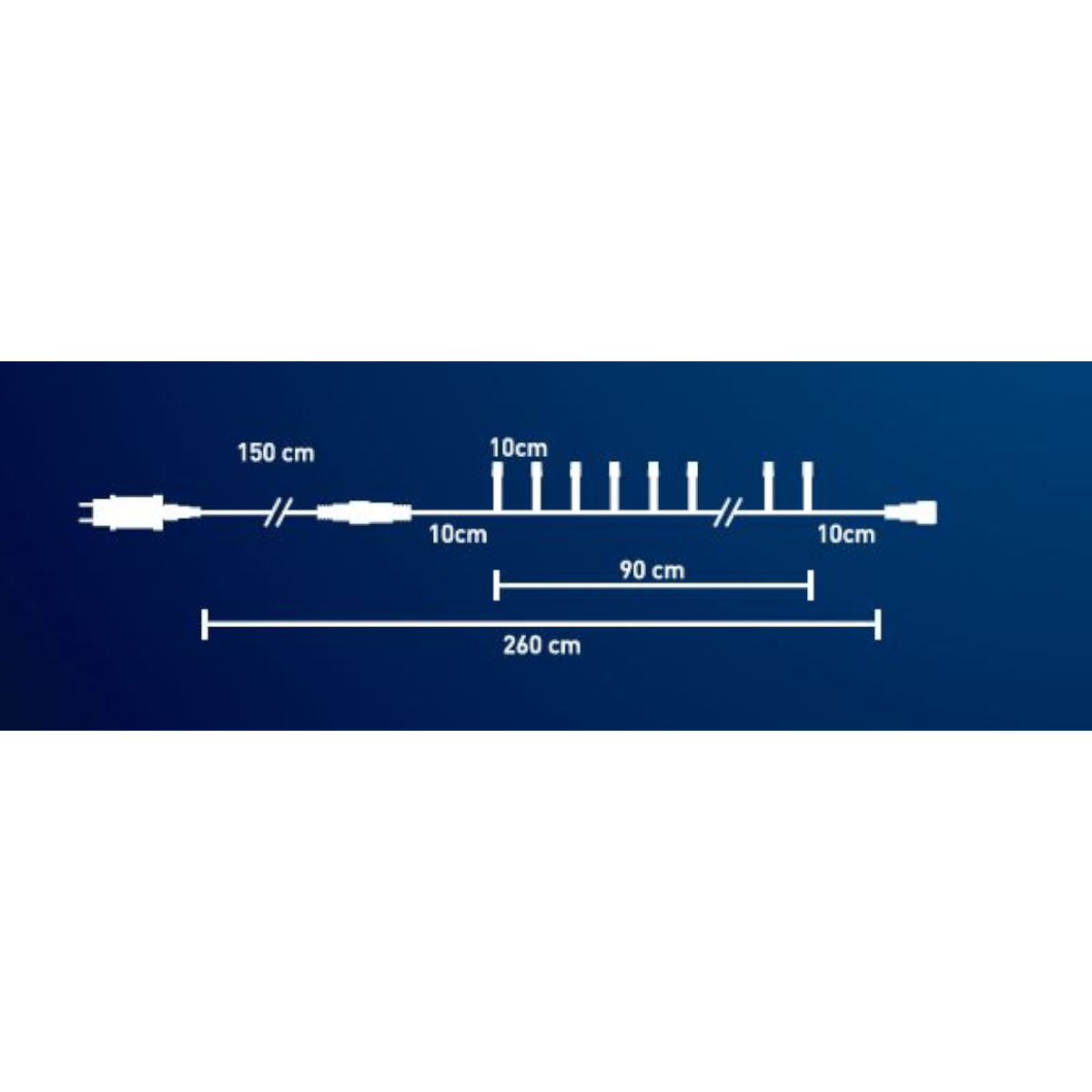 A 110 cm-es LED-es izzósorhoz 150 cm-es, fehér színű tápkábel tartozik, a csomag pedig minden szükséges elemet – transzformátort, tápkábelt és LED izzósort – tartalmaz az azonnali használathoz.