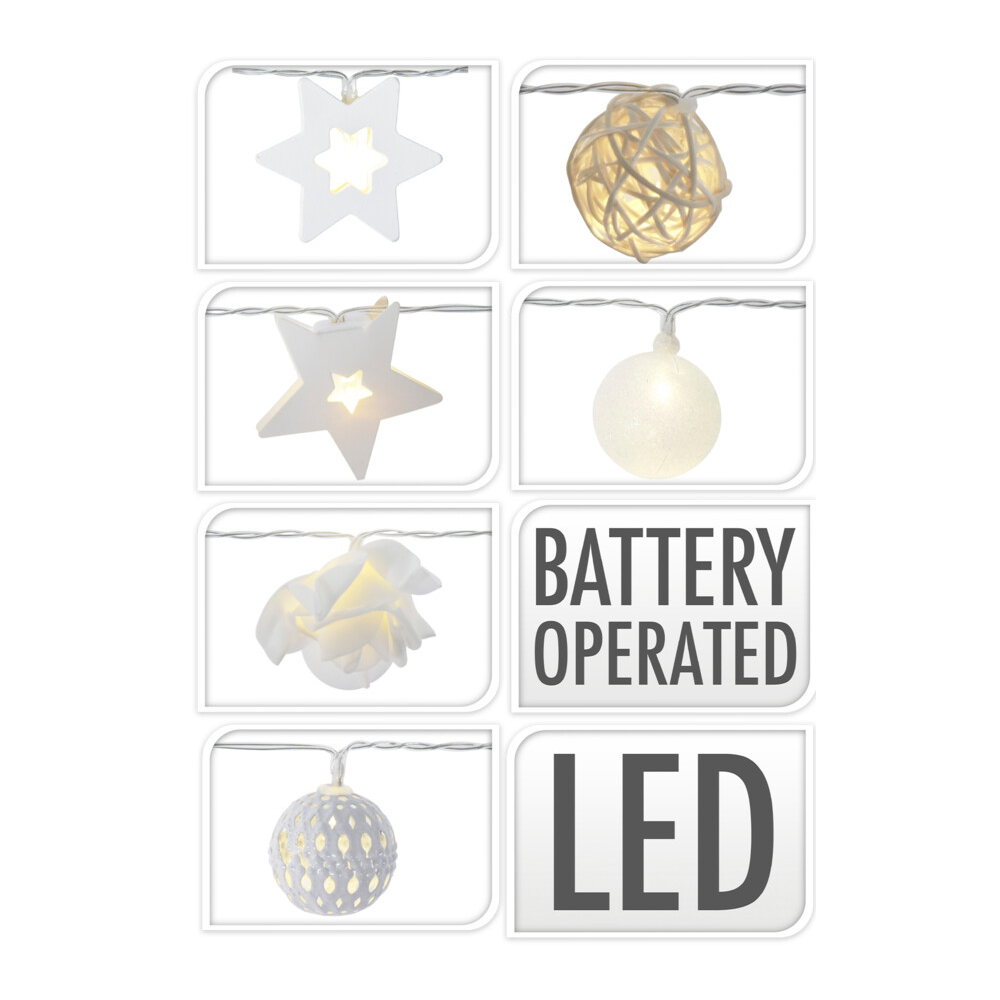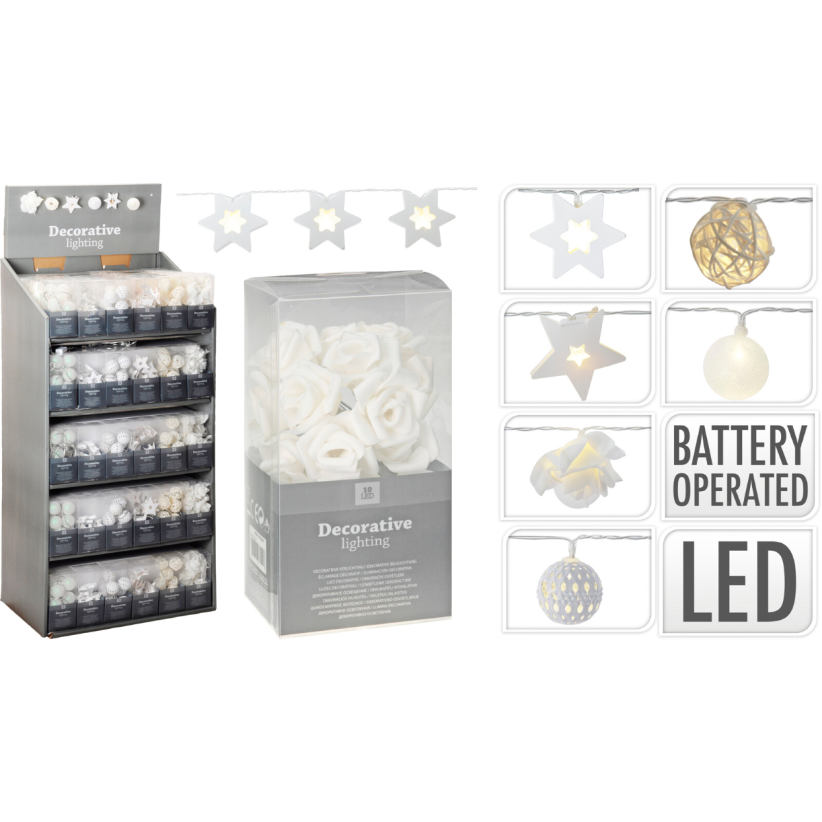 1 méteres 10 db melegfehér LED-es fényfüzér többféle modellben (csillag, gömbös, rózsafejes). 2 db AA elemmel működik, melyet a termék nem tartalmaz. A ragyogó fények tökéletesen kiegészítik a karácsonyi dekorációt és meghitt hangulatot teremtenek, így tökéletes választás ez a karácsonyi dekorációs termék.
