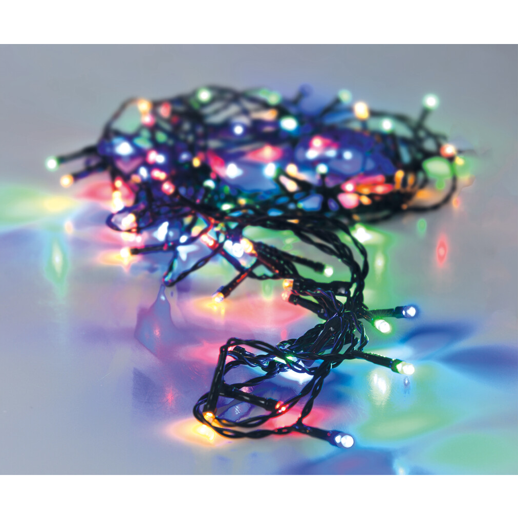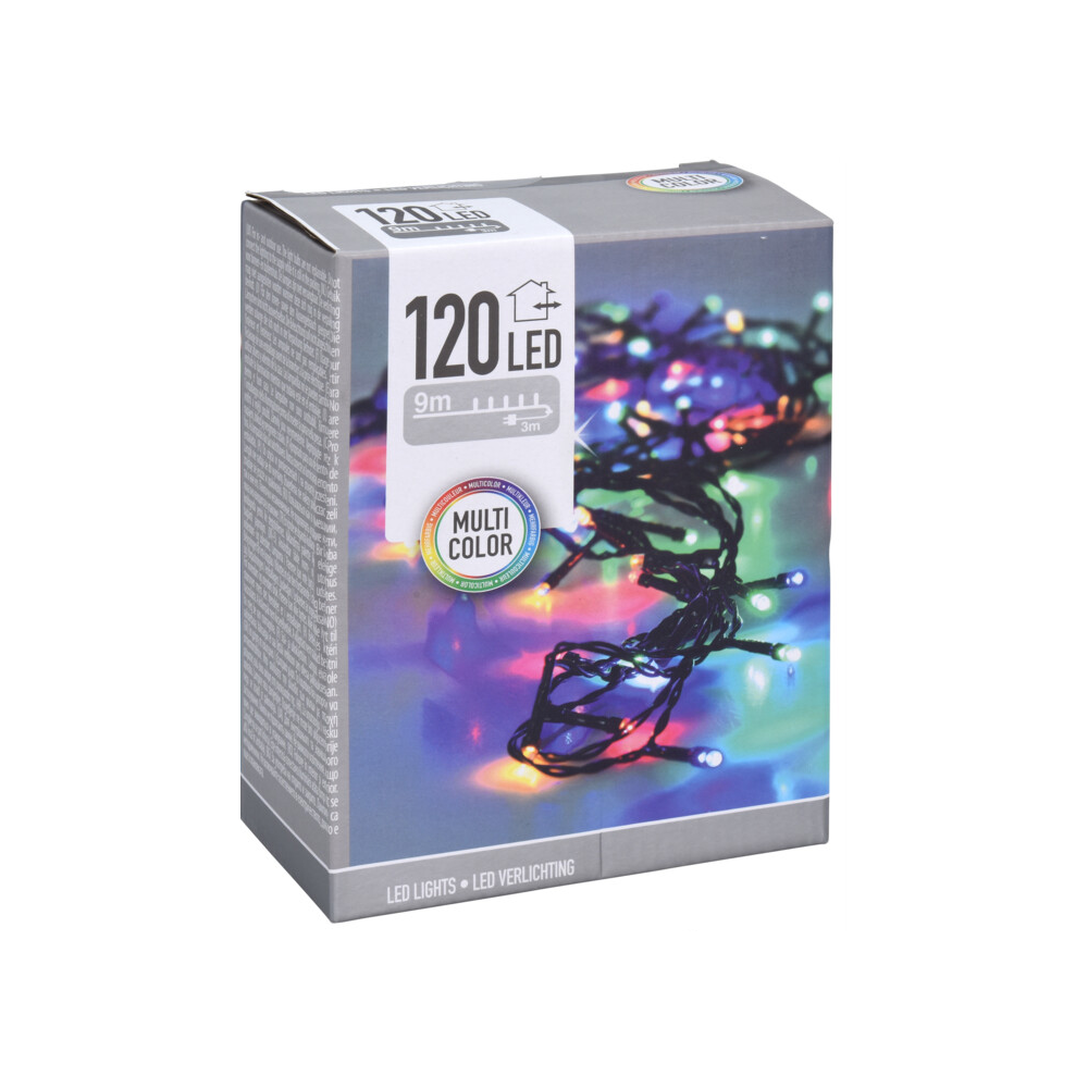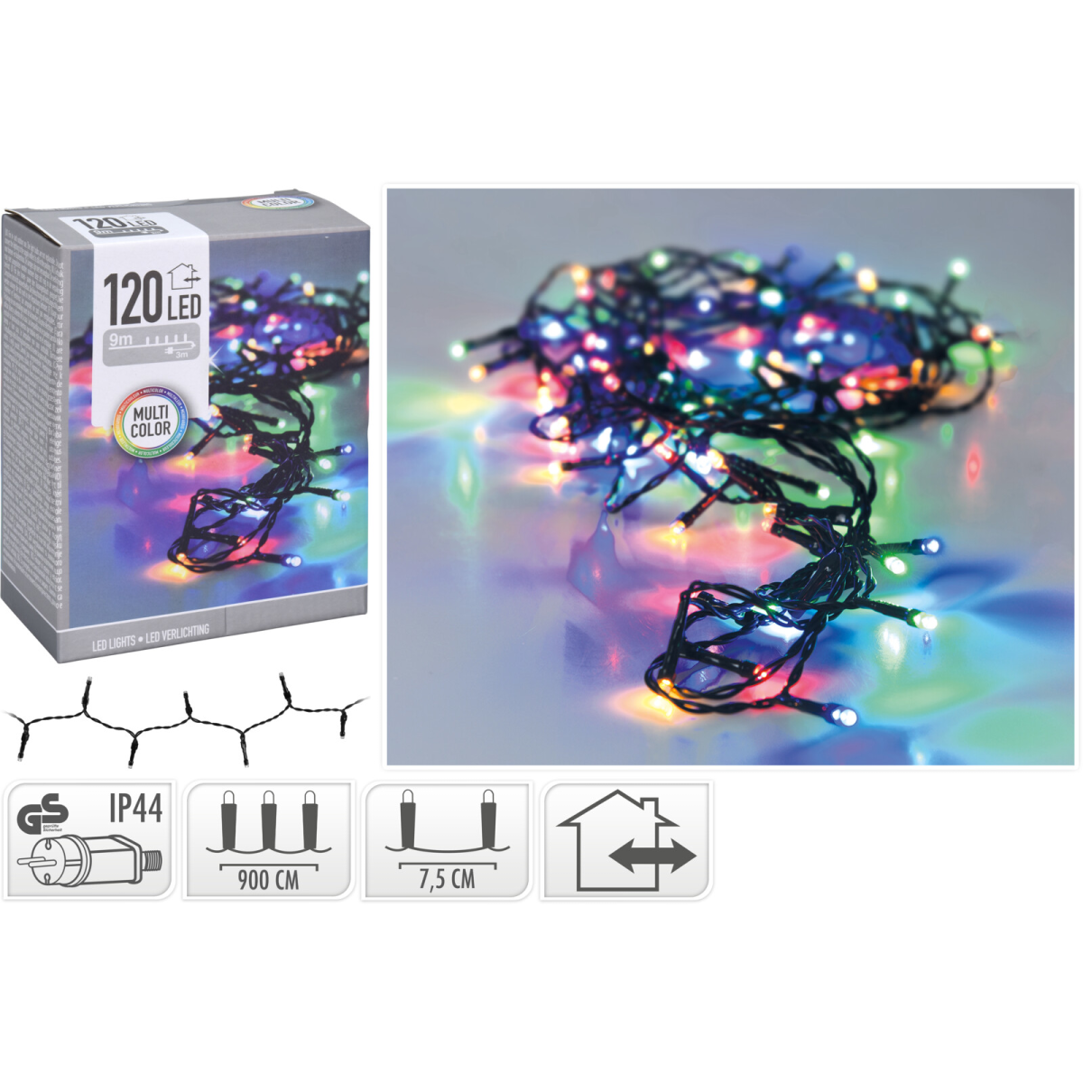 Varázsolj meghitt ünnepi hangulatot otthonodba ezzel a gyönyörű karácsonyi fényfüzérrel. Ragyogó fénye tökéletesen kiegészíti a karácsonyi dekorációt. Kül- és beltéri dekorálásra egyaránt alkalmas, 9 méter hosszú, 120 LED-es színes fényfüzér, 5 mm-es gömbökkel, 7,5 cm távolsággal a LED-ek között, 3 méteres zöld színű vezetékkel. Hálózatról működik, IP44 elektromos adapterrel, 230 V, 50 Hz, 31-120 mA, 3,6 VA. Vezeték keresztmetszet: 0,15 mm2.