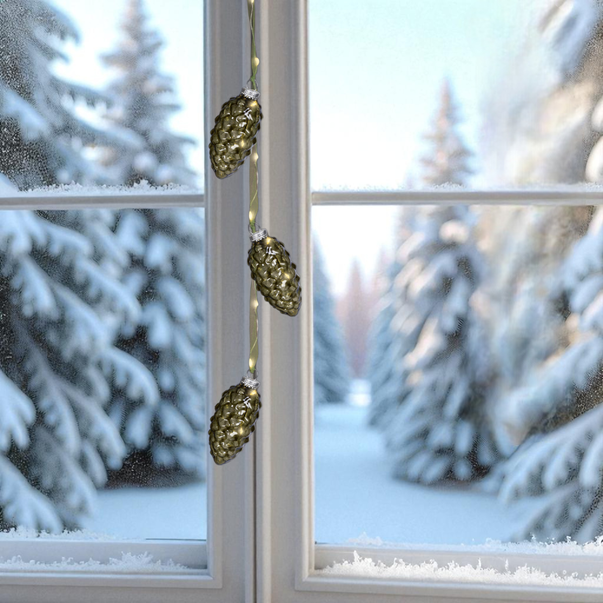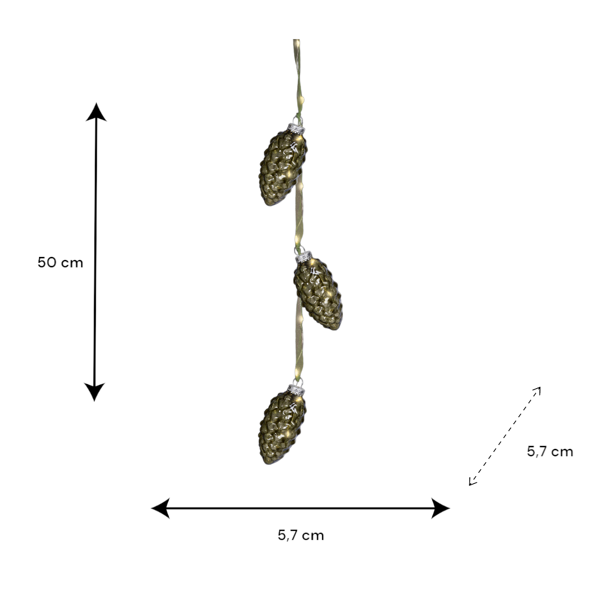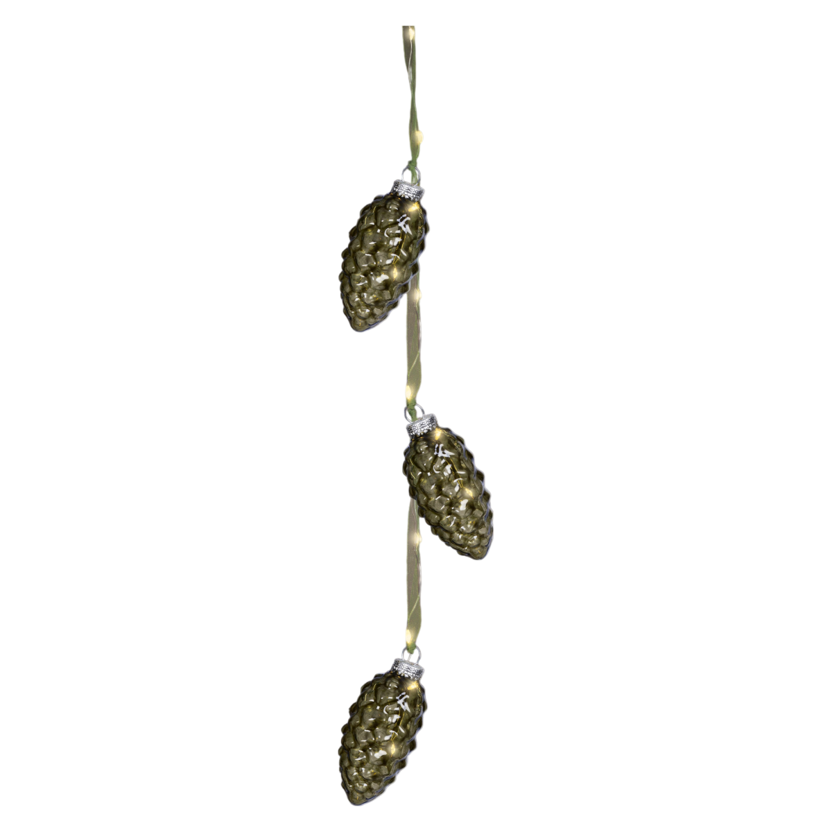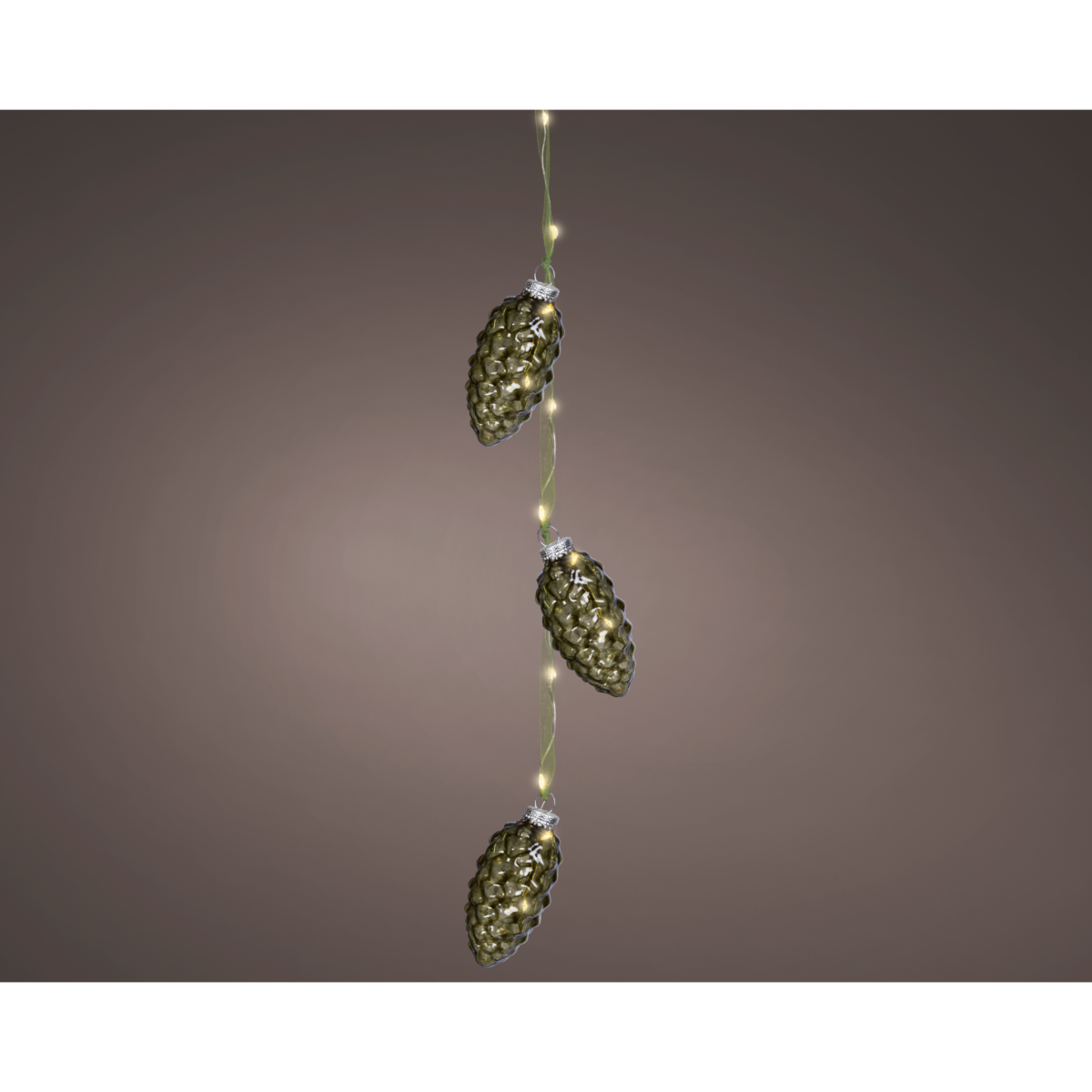 Ez az elegáns, ünnepi fényfüzér 50 cm hosszú, és 15 darab melegfehér LED-del világítja meg a három dekoratív, üveghatású tobozdíszt. A szalagra felfüggesztett formák finom, természetes megjelenést kölcsönöznek a füzérnek, így tökéletes választás karácsonyi díszítéshez vagy hangulatteremtő világításhoz beltéren.