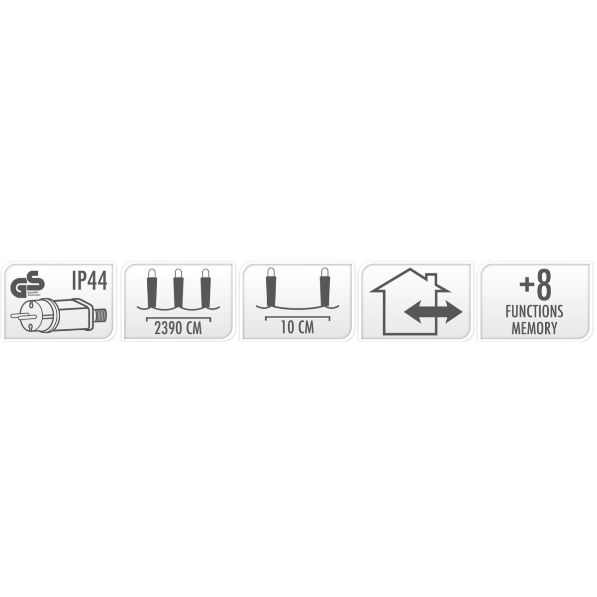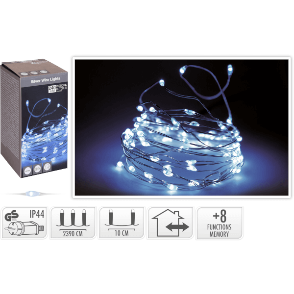 Kültéri fényfüzér 240 fehér mikro LED-del, 23,9m hosszú, 3 méteres vezetékkel, 8 funkciós szabályozóval, IP44 védettségű adapterrel. Ezzel a dekorációs fénnyel biztosan egyedi hangulatot varázsolhatunk otthonunkban vagy akár a teraszon.