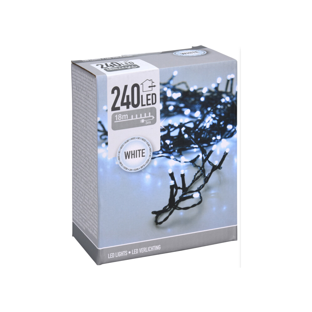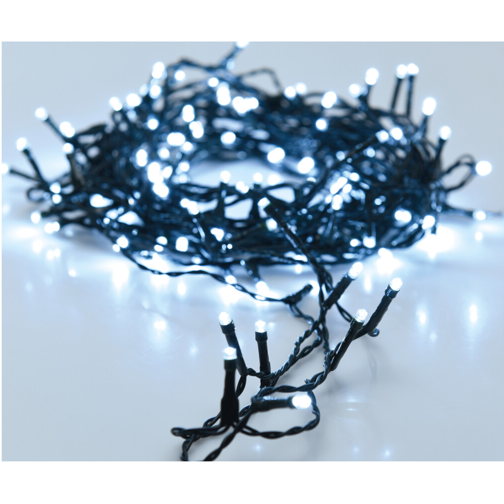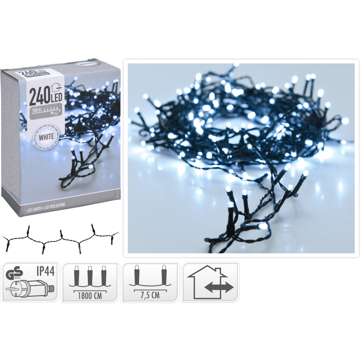 Varázsolj meghitt ünnepi hangulatot otthonodba ezzel a gyönyörű karácsonyi fényfüzérrel. Ragyogó fénye tökéletesen kiegészíti a karácsonyi dekorációt. Kül- és beltéri dekorálásra egyaránt alkalmas, 240 LED-es fehér, 18 m hosszú égősor, 3 m hosszú zöld színű vezetékkel. A LED-ek közötti távolság 7,5 cm. Hálózatról működik, IP44 elektromos adapterrel, 230 V. 50 Hz, 31 V-193 mA, 6 VA. Vezeték keresztmetszet: 0,15 mm2.