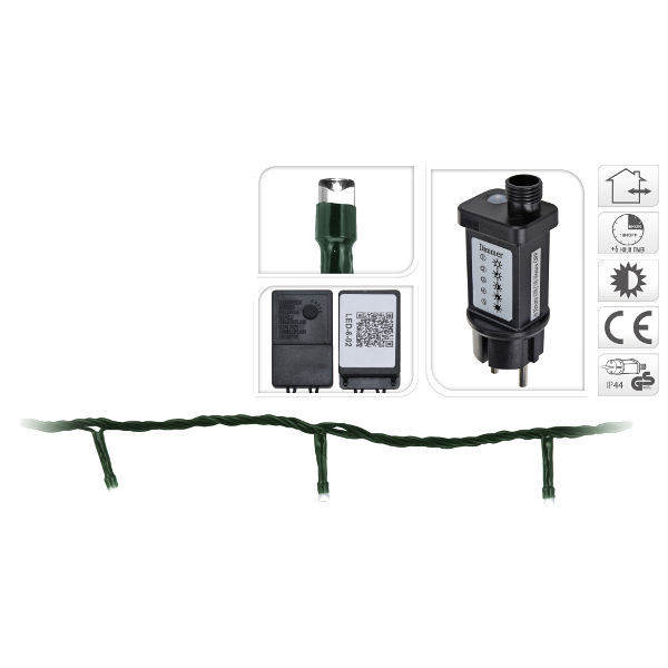 Kültéri 240 LED-es színes fényfüzér. 5 mm-es gömbök, 3 m vezeték, zöld vezeték. 7,5 cm távolság a LED-ek között. IP44 adapterrel. 230V 50Hz, 24V-250mA, 6VA. Időzítőt és fényerőszabályzót tartalmaz.