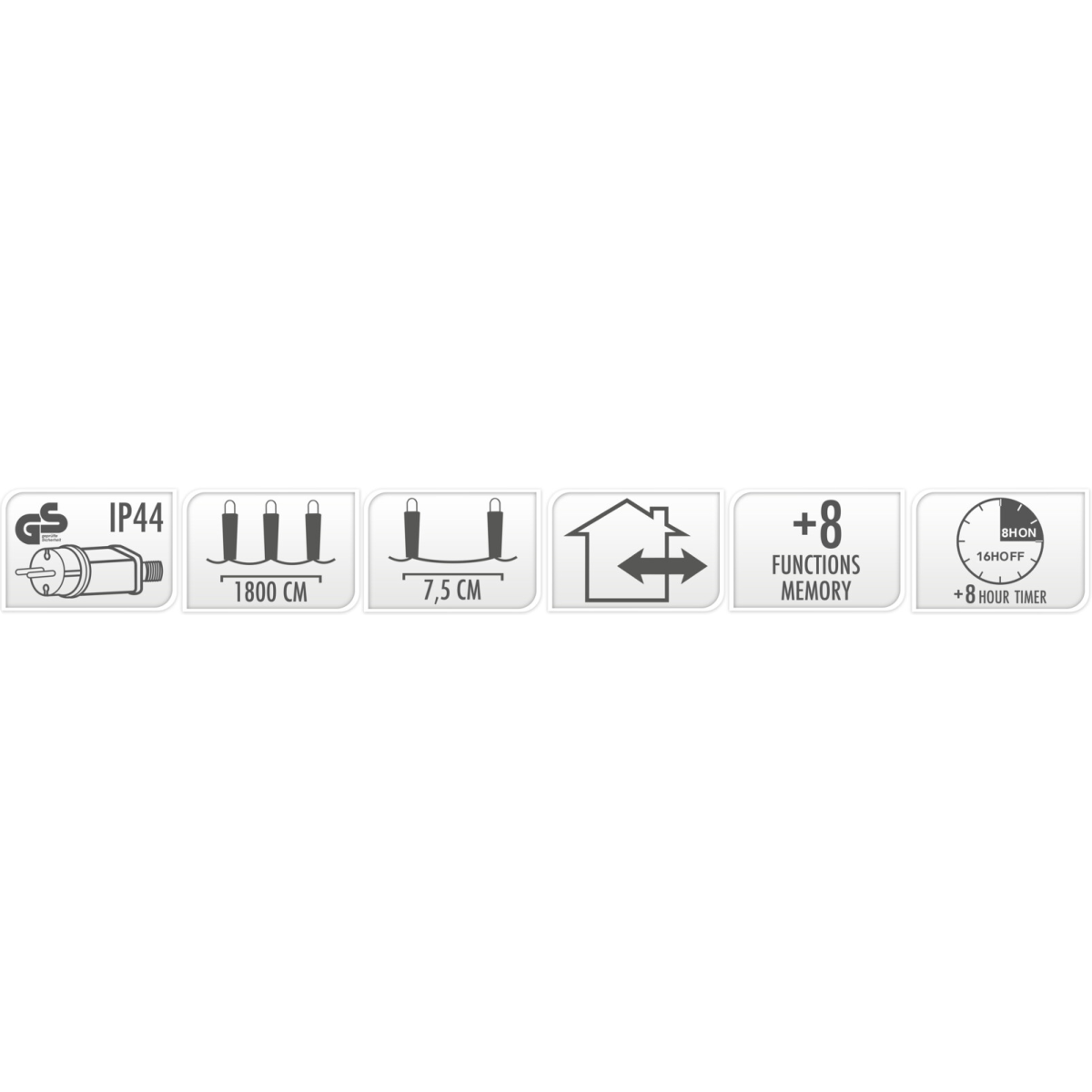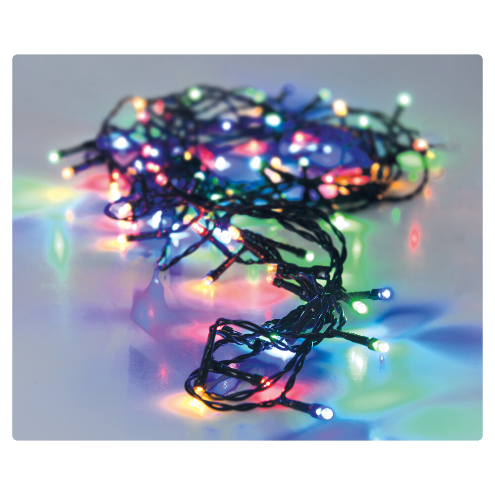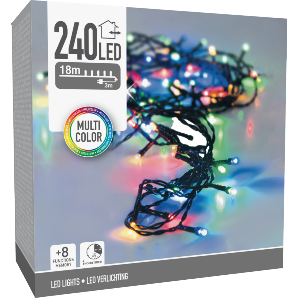 Kültéri 240 színes LED-es 18 méteres fényfüzér, 3 m vezetékkel. A LED-ek 7,5 cm távolságra vannak egymástól. IP44 védettségű adapterrel rendelkezik és 8 funkciós memóriás vezérlővel. Varázsold ünnepi hangulatba otthonodat ezzel a gyönyörű kültéri karácsonyi fényfüzérrel! A ragyogó fények tökéletesen kiegészítik a karácsonyi dekorációt, és meghittséget hoznak. Egyszerűen használható így gondtalanul élvezheted az ünnepi fényeket!