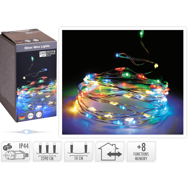 Kültéri fényfüzér 240 színes mikro LED-del, 23,9m hosszú, 3 méteres vezetékkel, 8 funkciós szabályozóval, IP44 védettségű adapterrel. Ezzel a dekorációs fénnyel igazán egyedi hangulatot varázsolhatunk otthonunkban vagy akár a teraszon.