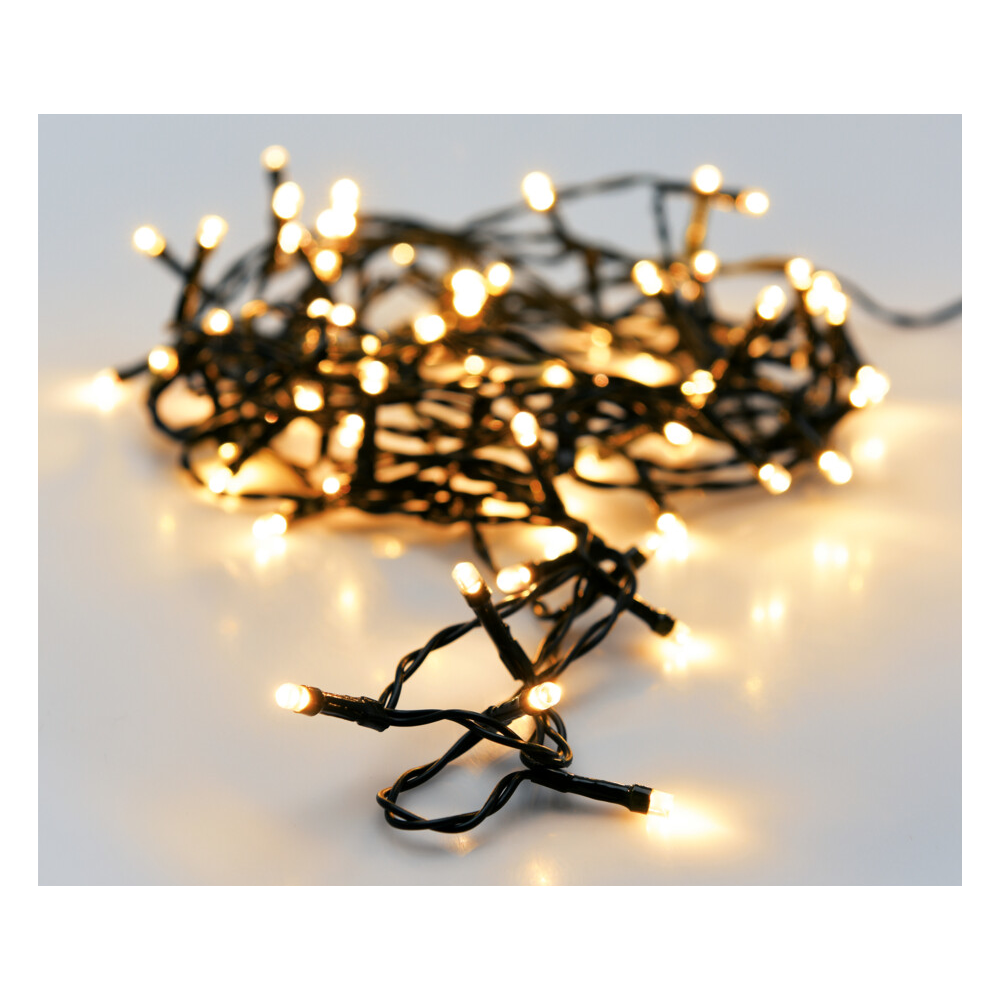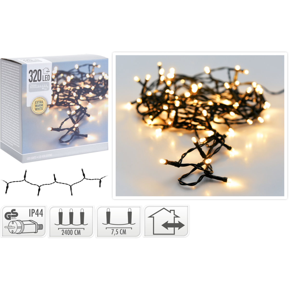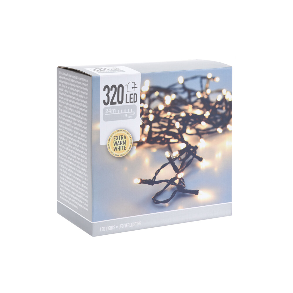 Varázsolj meghitt ünnepi hangulatot otthonodba ezzel a gyönyörű karácsonyi fényfüzérrel. Ragyogó fénye tökéletesen kiegészíti a karácsonyi dekorációt. Kül- és beltéri dekorálásra egyaránt alkalmas, 24 méter hosszú, 320 LED-es extra melegfehér fényfüzér, 5 mm-es gömbökkel, 7,5 cm távolsággal a LED-ek között, 3 méteres zöld színű vezetékkel. Hálózatról működik, IP44 elektromos adapterrel CE. Vezeték keresztmetszet: 0,15 mm2.