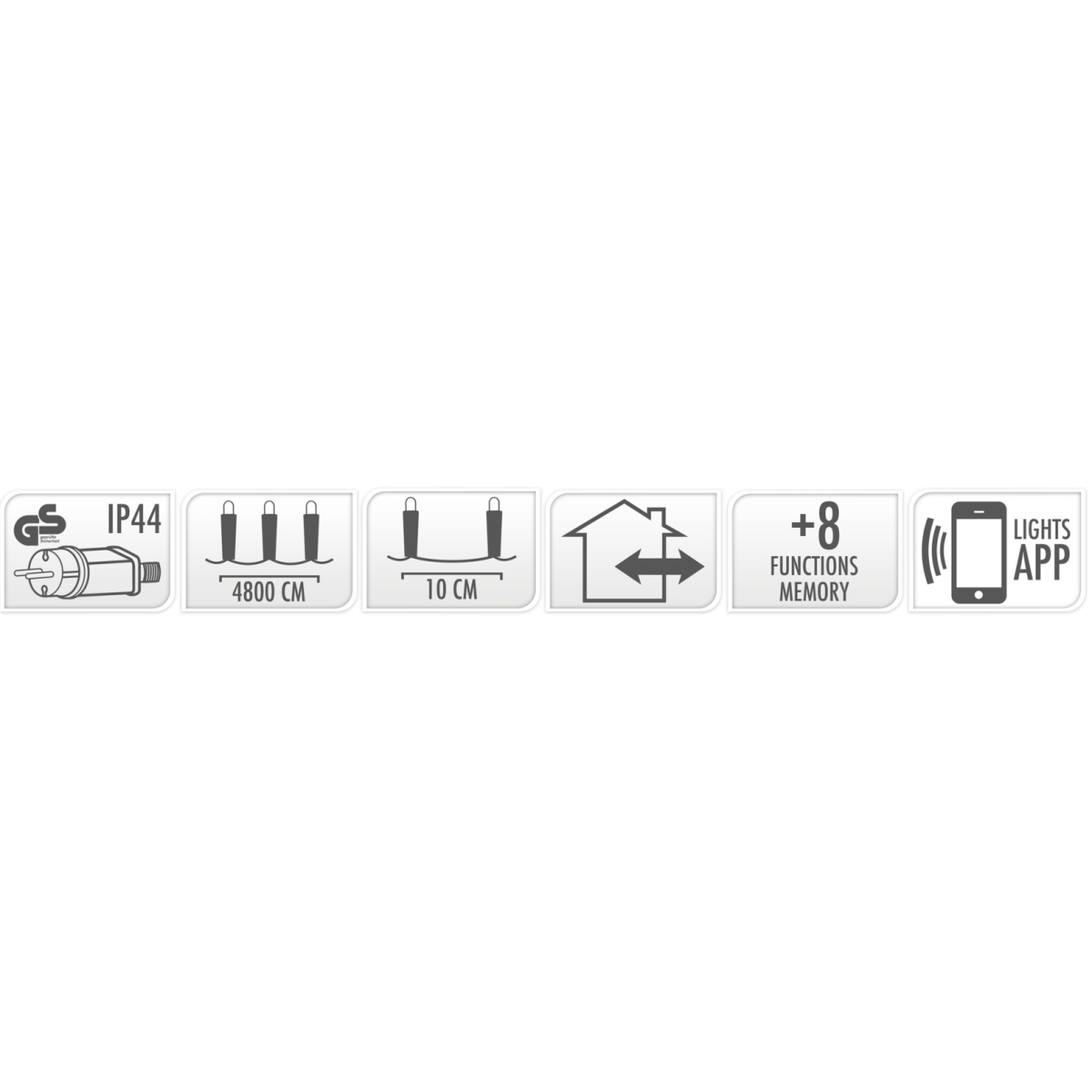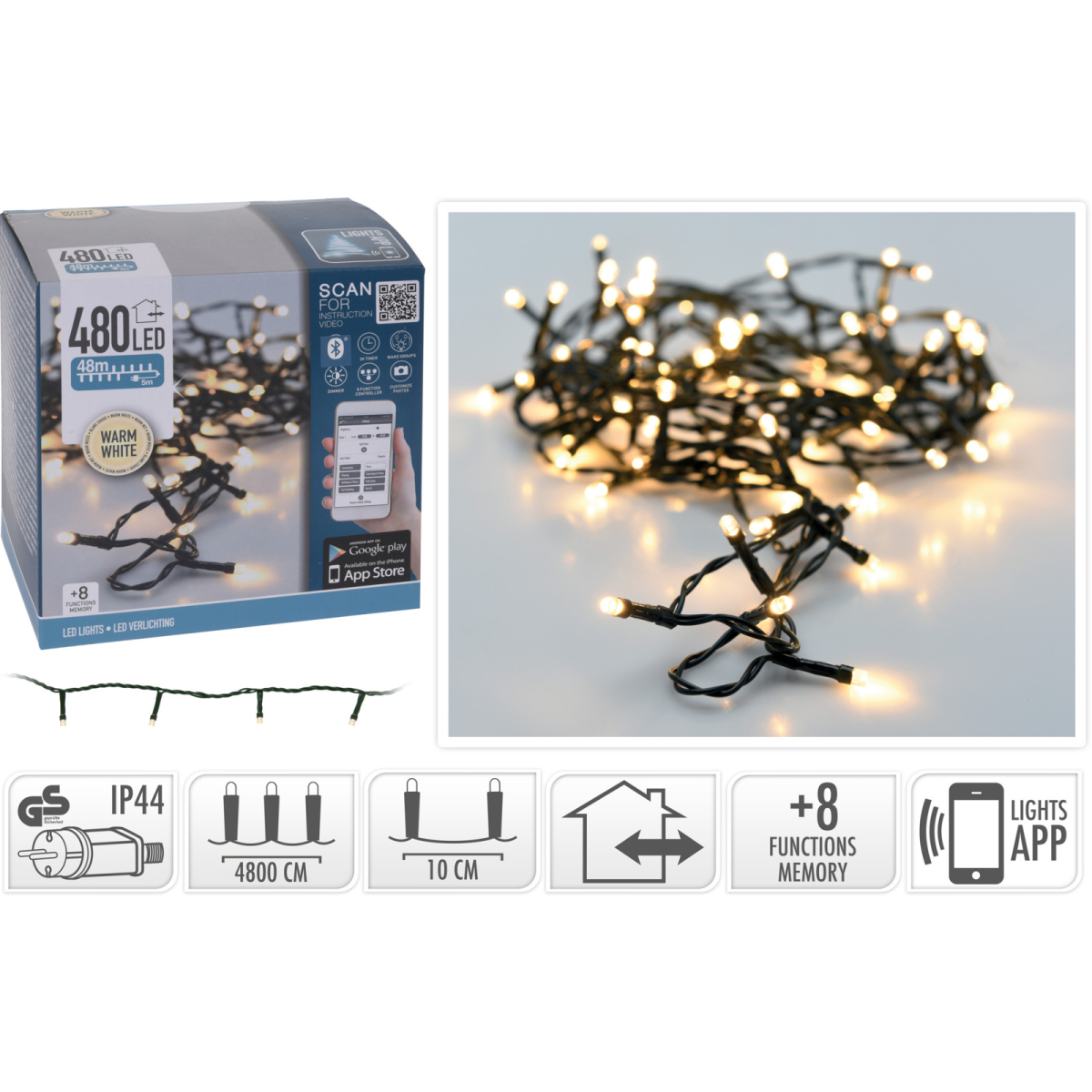 480 fehér LED-es, 48 méter hosszú (kábel hossza: 5 méter) fényfüzér, mely okostelefonnal irányítható.