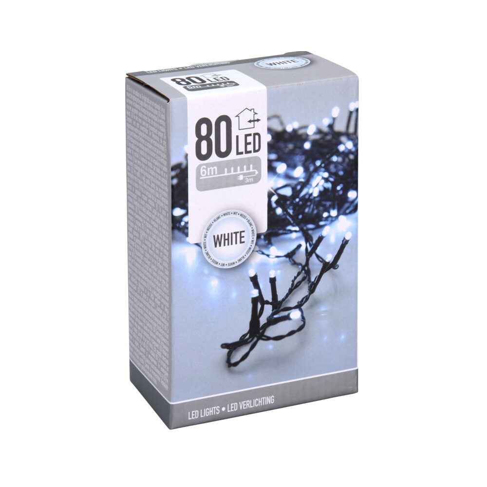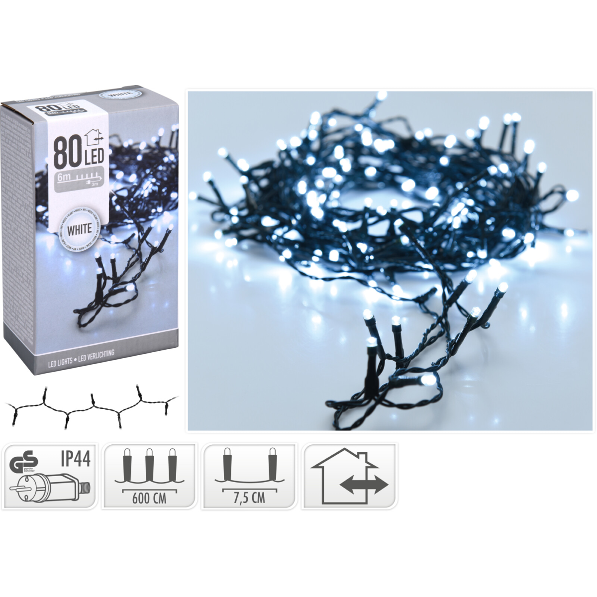 Varázsolj meghitt ünnepi hangulatot otthonodba ezzel a gyönyörű karácsonyi fényfüzérrel. Ragyogó fénye tökéletesen kiegészíti a karácsonyi dekorációt. Kül- és beltéri dekorálásra egyaránt alkalmas, 80 db fehér LED-et tartalmazó, 6 m hosszú égősor 5 mm-es gömbökkel, 3 m hosszú zöld színű vezetékkel. A LED-ek közötti távolság 7,5 cm. Hálózatról működik, IP44 elektromos adapterrel, 230 V, 50 Hz, 4,5V-300 mA, 6.35 VA. Vezeték keresztmetszete: 0,15 mm2.