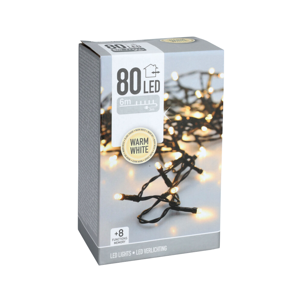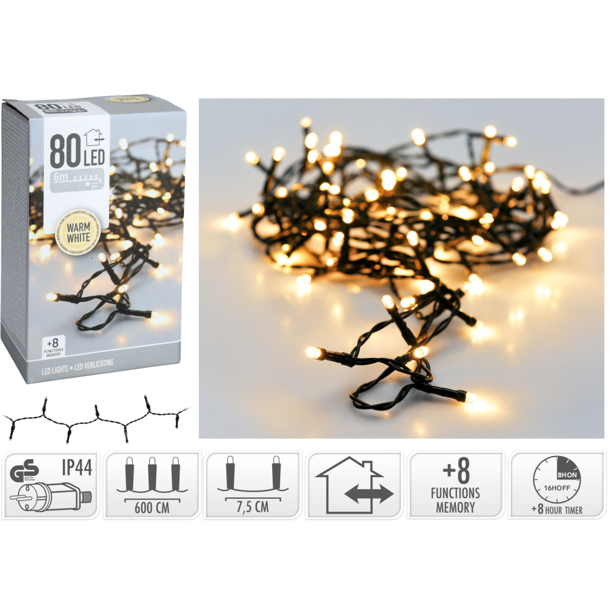 Varázsolj meghitt ünnepi hangulatot otthonodba ezzel a gyönyörű, 8 funkciós karácsonyi fényfüzérrel. Ragyogó fénye tökéletesen kiegészíti a karácsonyi dekorációt. Kül- és beltéri dekorálásra egyaránt alkalmas, 6 m hosszú 80 LED-es melegfehér fényfüzér, 5 mm-es gömbökkel, 7,5 cm távolsággal a LED-ek között, 3 méteres vezetékkel. Hálózatról működik, IP44 adapterrel. Vezeték keresztmetszet: 0,15mm2. Időkapcsolós: bekapcsolástól számított 8 órán keresztül működik, majd automatikusan lekapcsol és 16 óra múlva automatikusan bekapcsol.