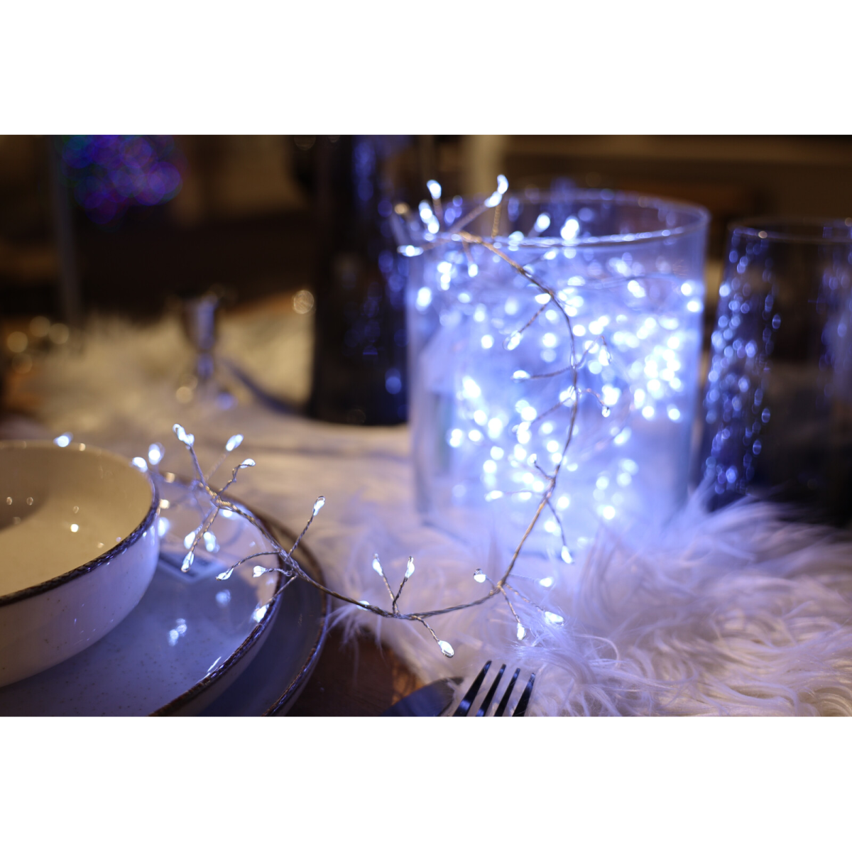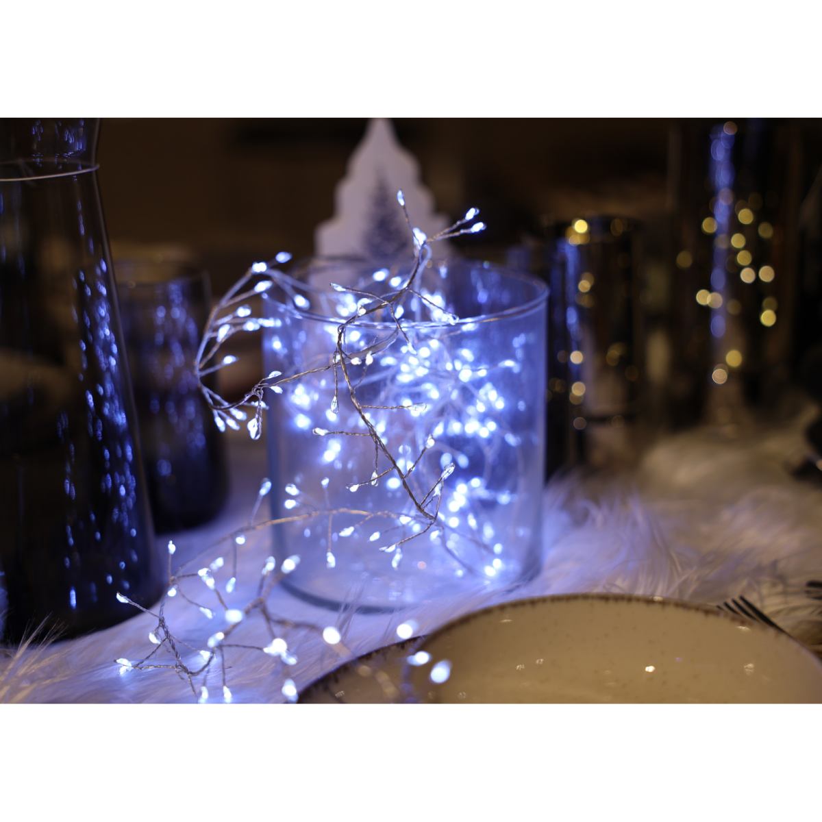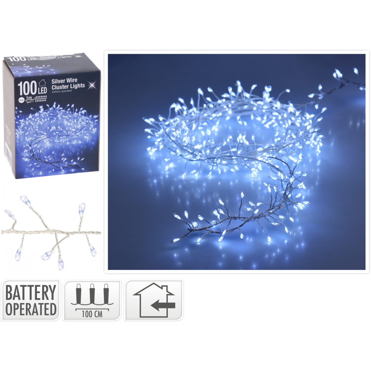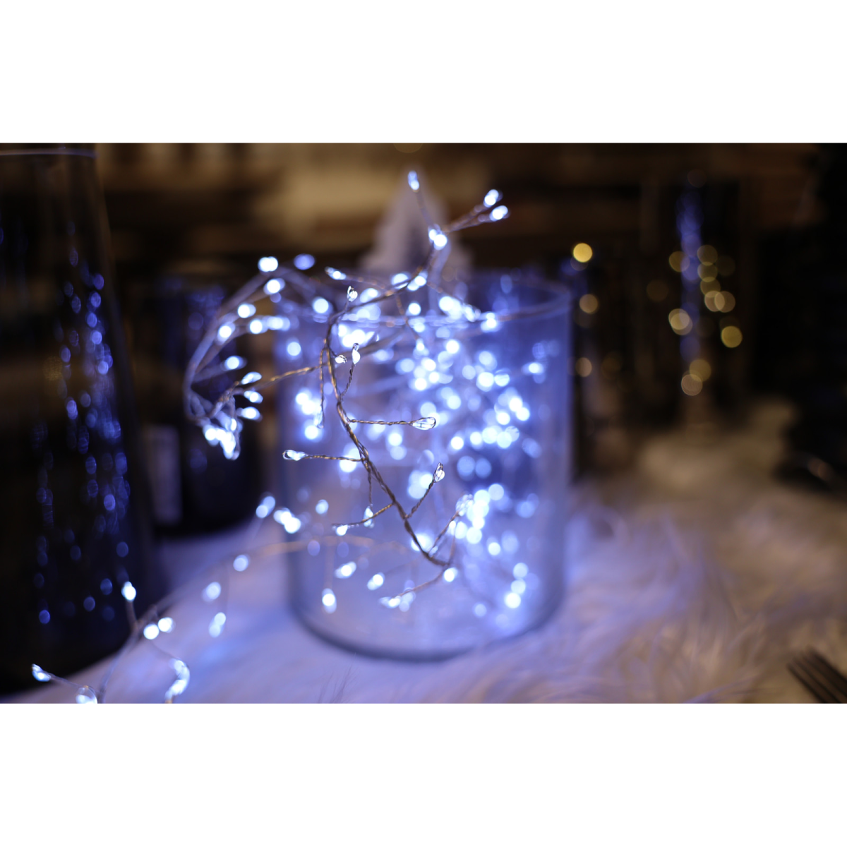 A fényfűzér egy sokoldalúan használható beltéri fénydekoráció, amely 100 darab LED izzót tartalmaz. A hideg fehér fényű izzók tiszta és modern megjelenést biztosítanak. A LED-ek egymástól való távolsága 1cm. A fénysor hossza 1 méter, a hálózati kábel hossza 0.3 méter. 3xAA-s elemmel működik, mely nem képezi a csomag részét.